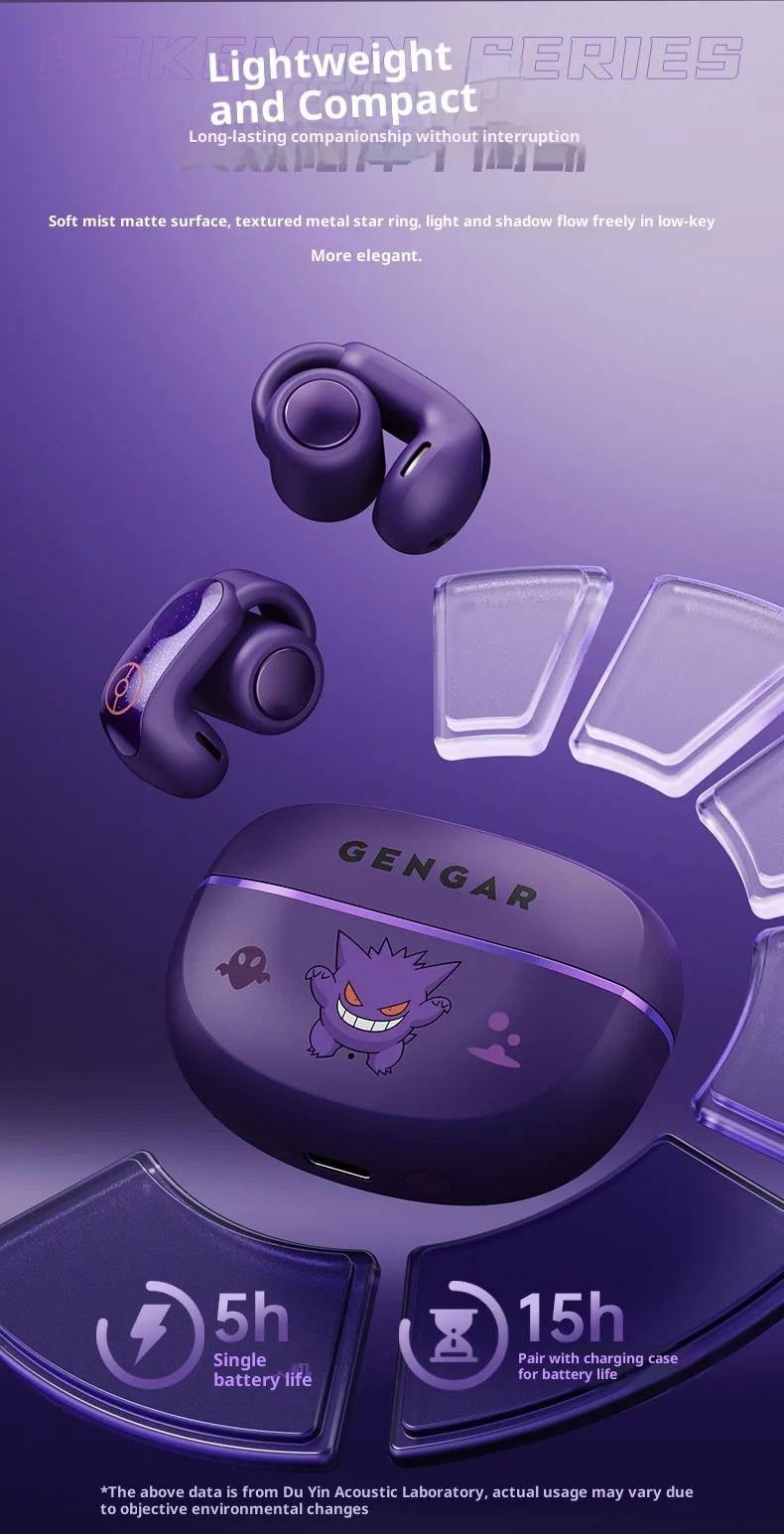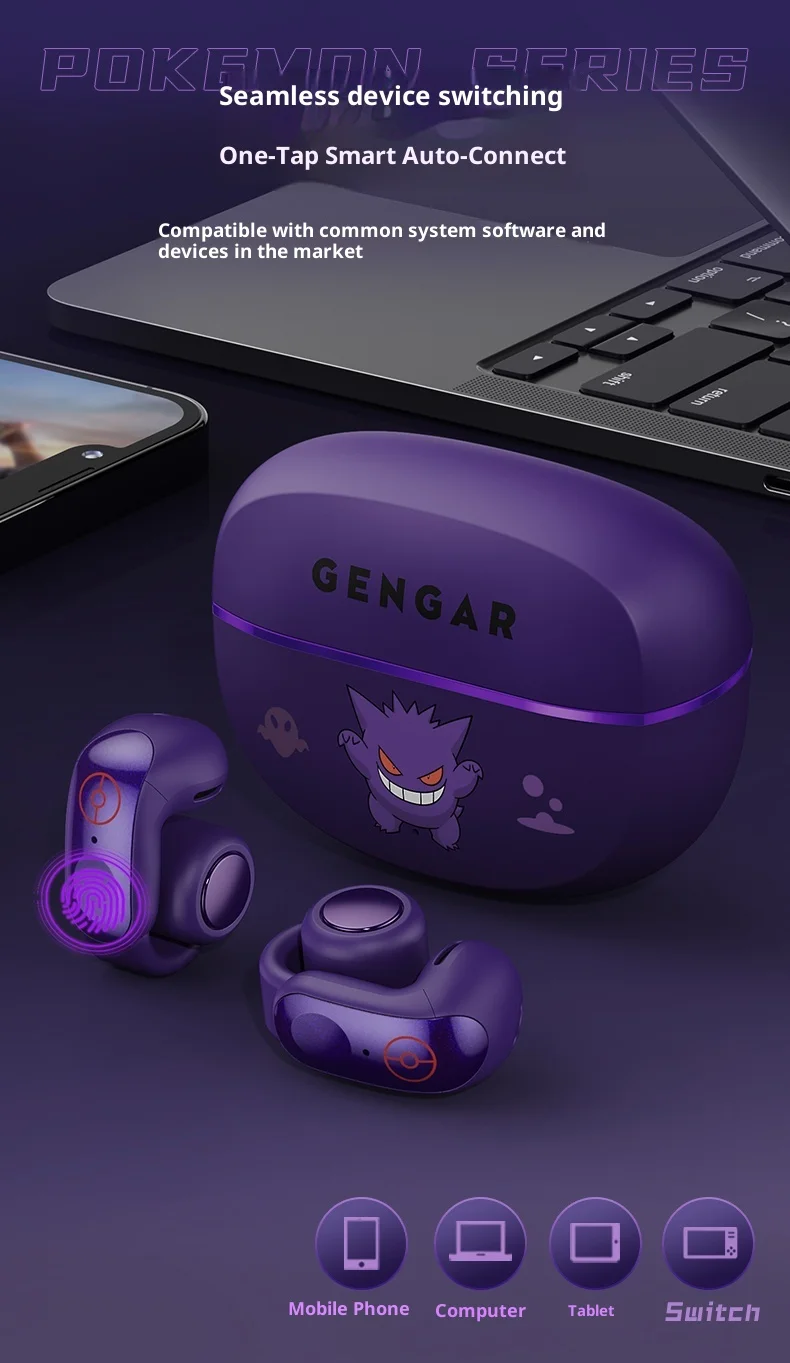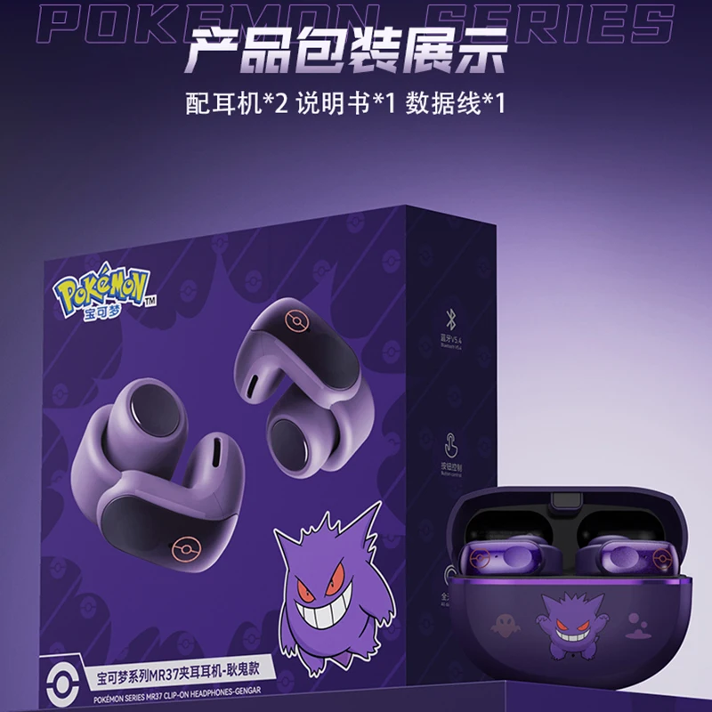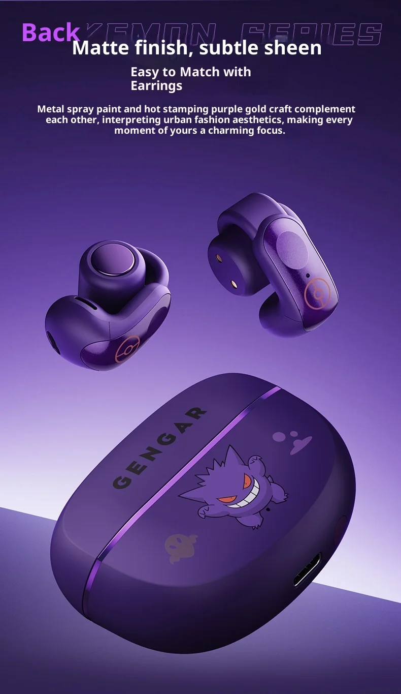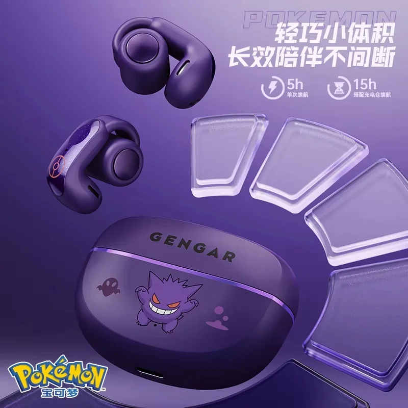 Gengar PokéMon 블루투스 헤드셋 이어 클립 Hifi 스테레오 무선 게임 스포츠 이어 버드 긴 배터리 수명 유행 애니메이션 선물
