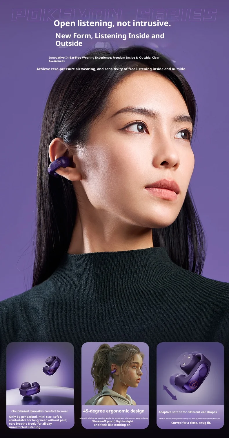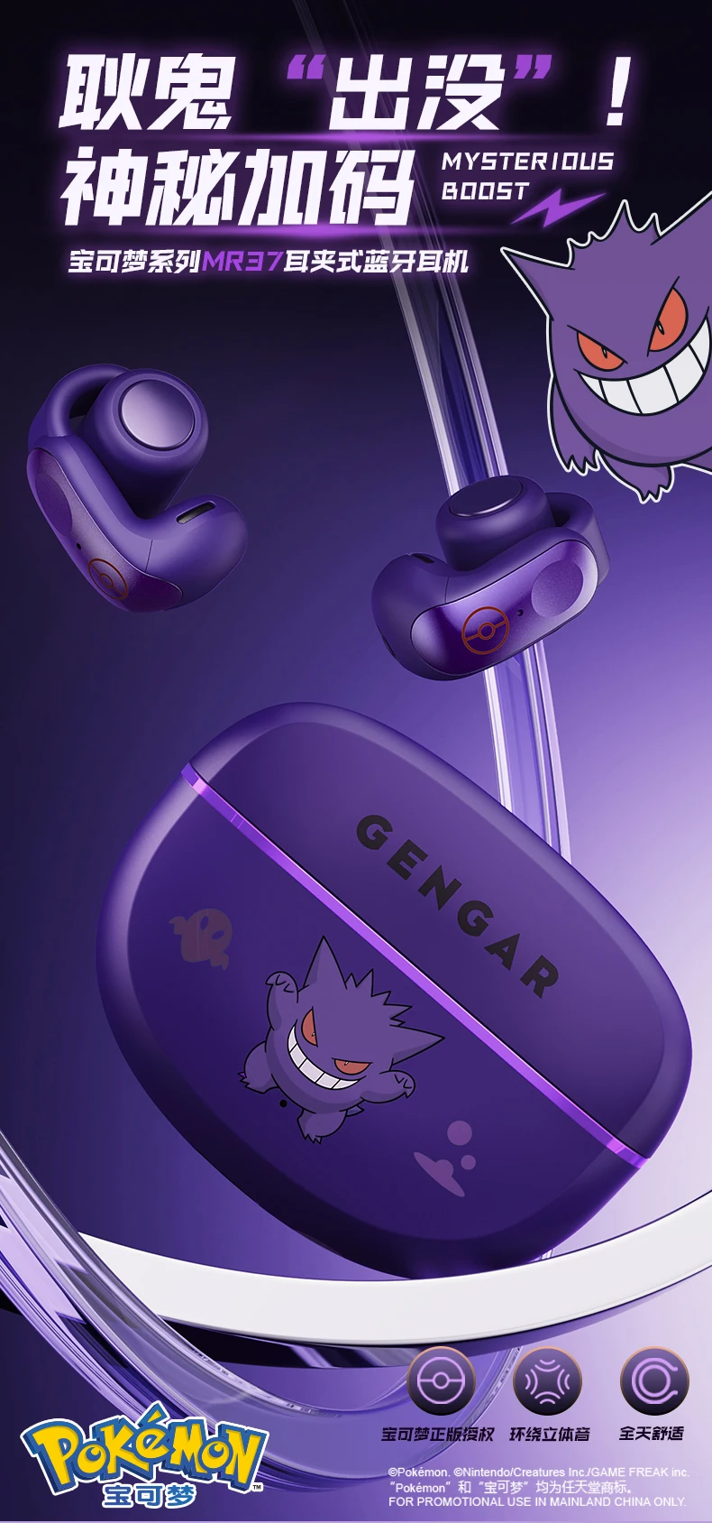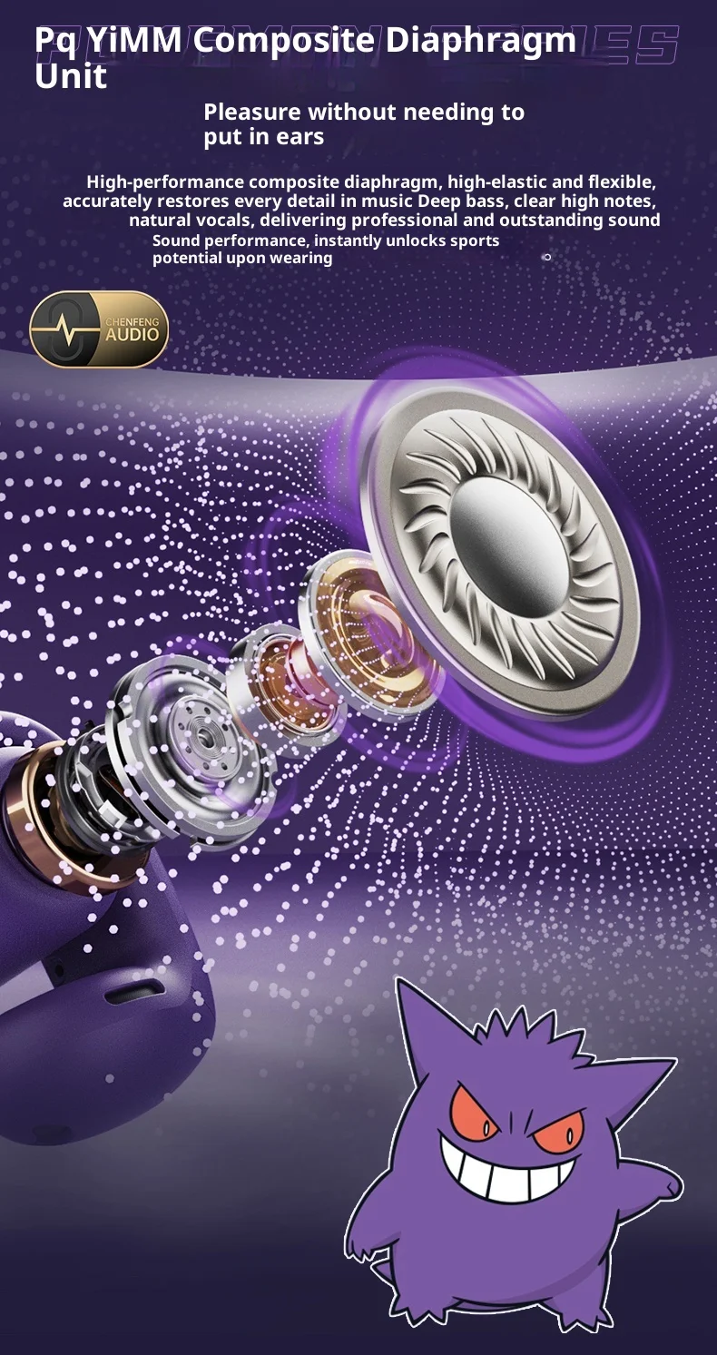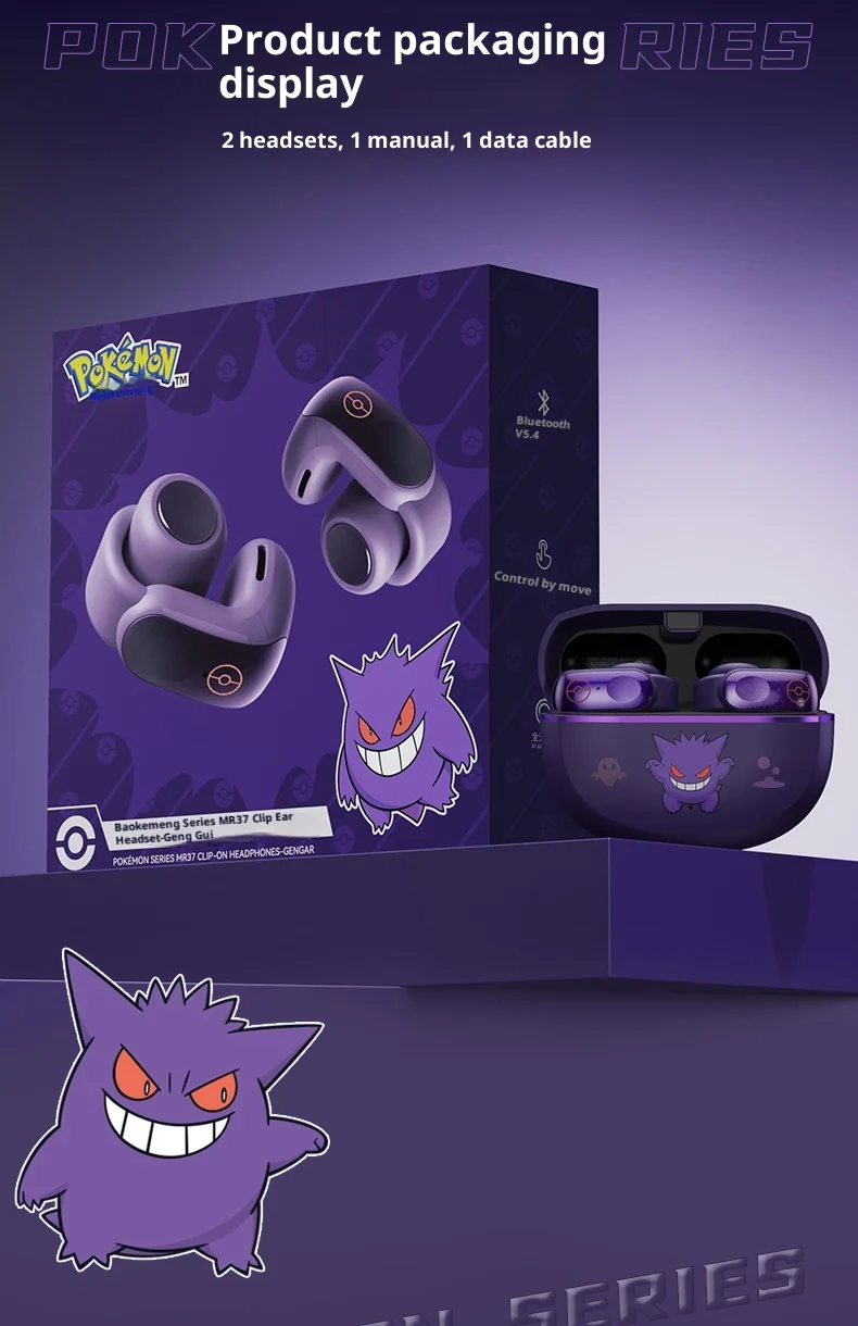 Gengar PokéMon 블루투스 헤드셋 이어 클립 Hifi 스테레오 무선 게임 스포츠 이어 버드 긴 배터리 수명 유행 애니메이션 선물