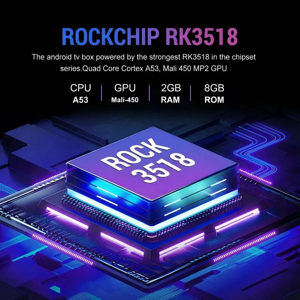 강력한 Rockchip 3518 프로세서: 일상적인 스트리밍 및 앱에서 신뢰할 수 있는 디코딩과 안정적인 비디오 출력을 제공합니다.