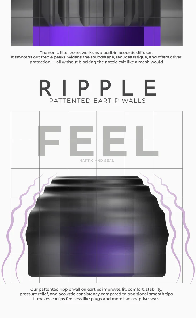 Sonic Filtering Zone은 내장된 음향 증폭기처럼 작동합니다.고주파 피크를 부드럽게 하고, 사운드 스테이지를 넓히며, 청취 피로를 줄이고, 드라이버를 보호합니다.또한 메쉬 필터처럼 사운드 아웃렛을 차단하지 않습니다.