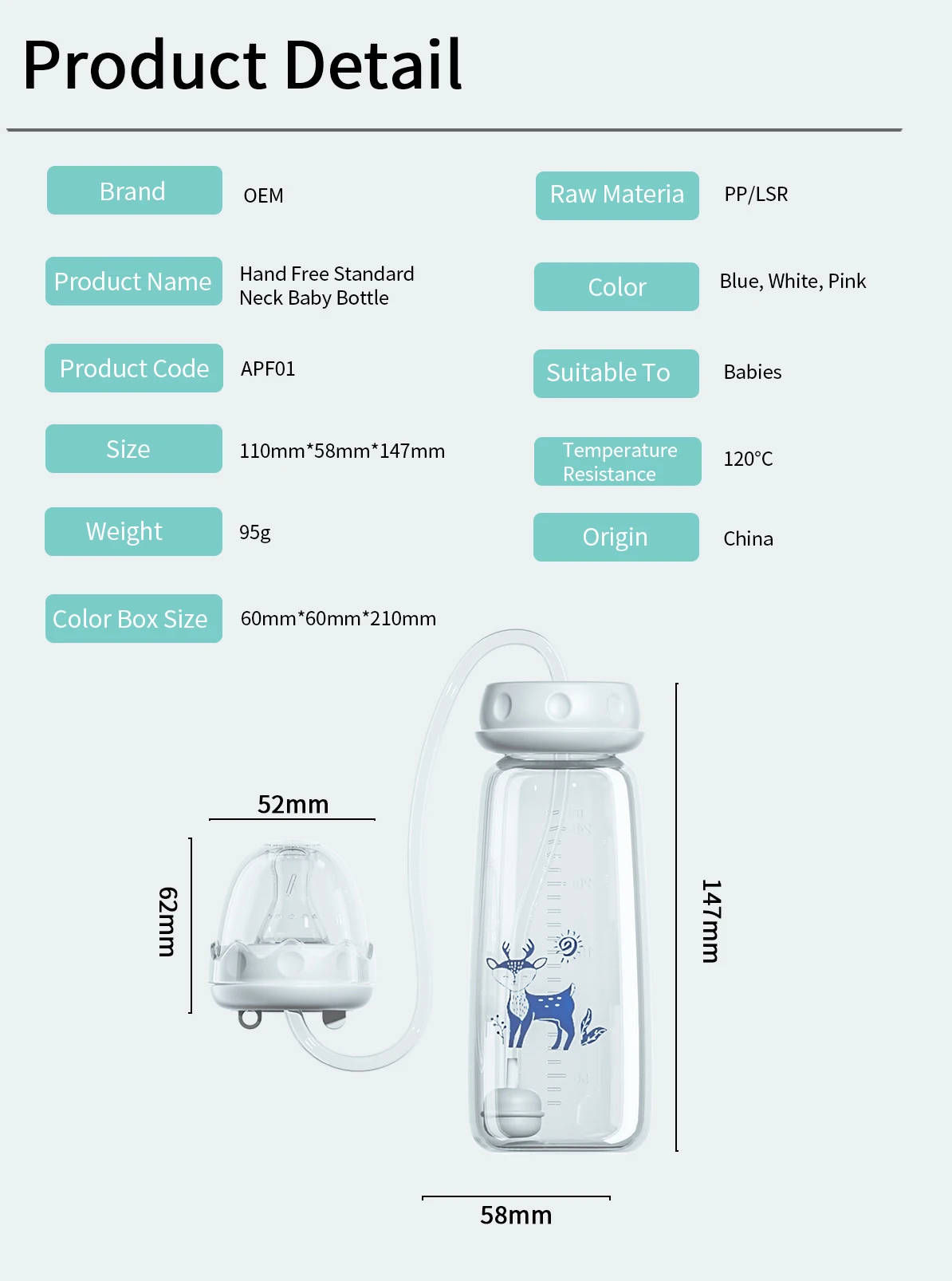 아기와 엄마 모두가 좋아하는 제품 – 두 가지 색상(핑크, 블루)으로 제공됩니다.측정값은 온스와 밀리리터 단위로 병 측면에 명확하게 표시되어 있습니다.아기가 스스로 잡고 먹을 수 있을 때 사용할 수 있는 탈착식 손잡이; 매우 중요한 발달 단계에서 운동 능력을 촉진합니다.