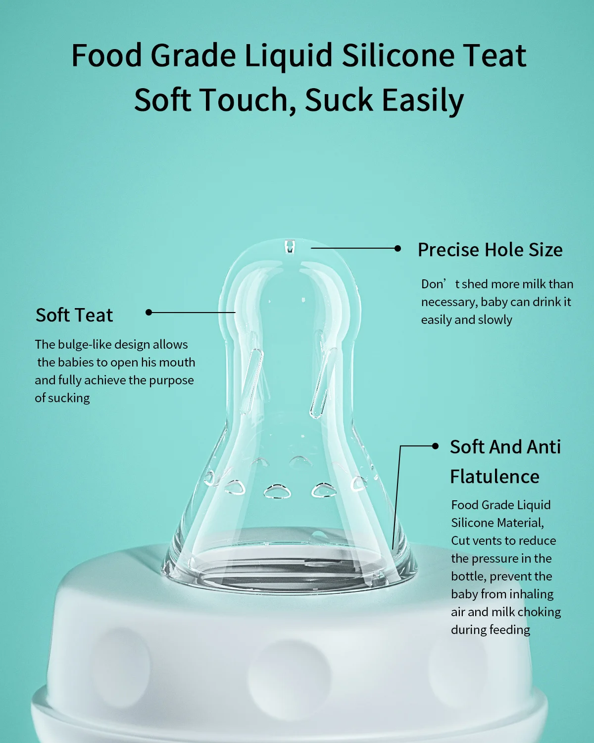 래치 온 니플 – 모유 수유와 유사하게 설계된 니플로, 모유 수유와 젖병 수유를 번갈아 사용하고 싶은 엄마들이나 젖병 수유로 전환하는 아기들에게 적합합니다.부드러운 젖꼭지는 젖을 물기 쉽도록 도와주고 수유 중 젖병에 젖이 새는 것을 줄여줍니다.