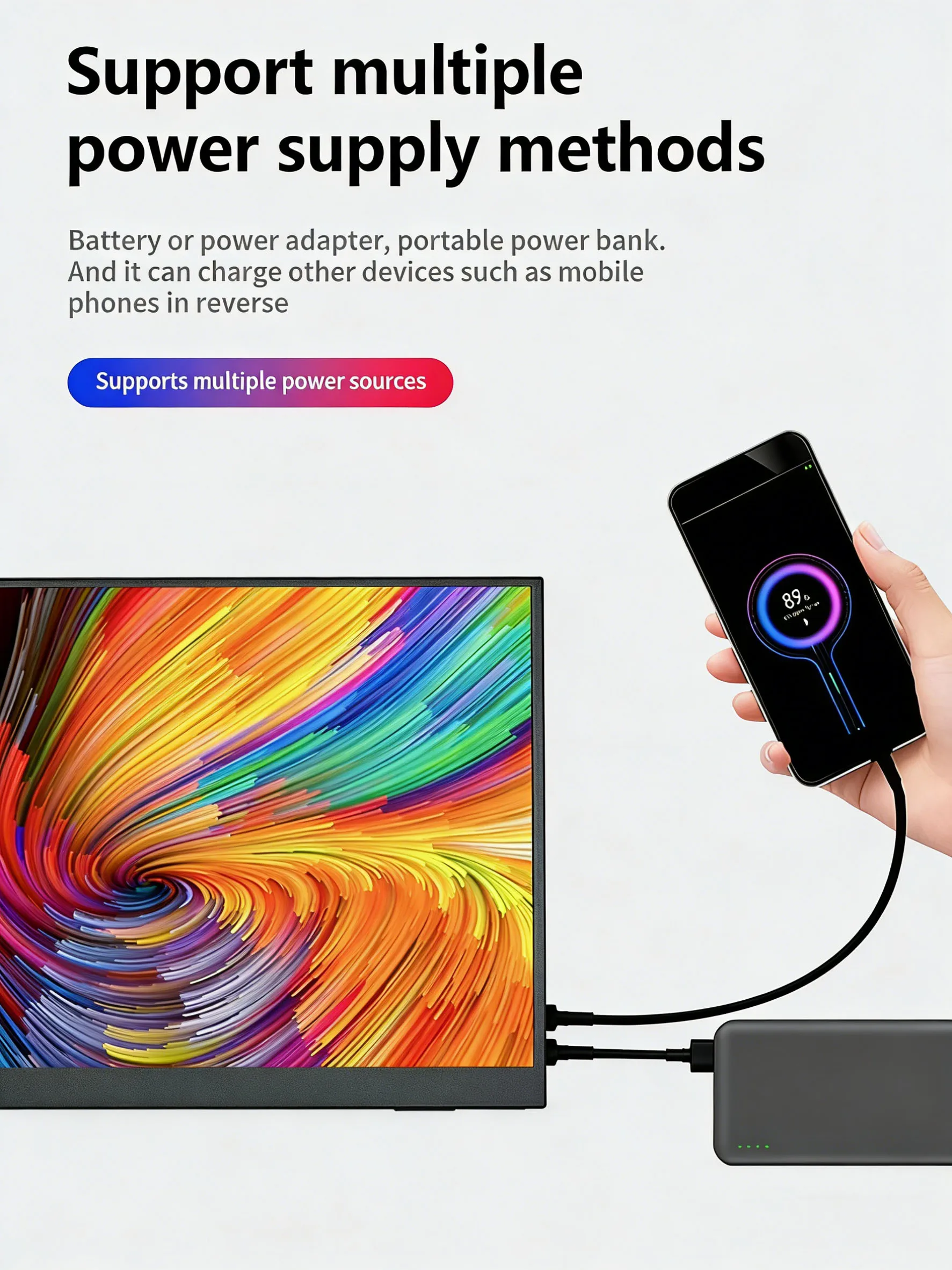 2. 휴대성과 경량화: 무선 디스플레이 모니터는 2개의 풀 기능 타입-C 포트와 미니 HDMI 포트를 제공하며, 대부분의 노트북, PC, PS4, Xbox와 호환됩니다. 박스에는 타입-A 케이블, 타입-C 케이블, HDMI 케이블이 포함되어 있어 추가 액세서리를 별도로 구매할 필요가 없습니다. 초경량 및 초슬림 디자인은 이동 중이나 홈 오피스에 완벽한 선택입니다.