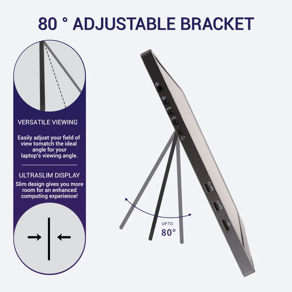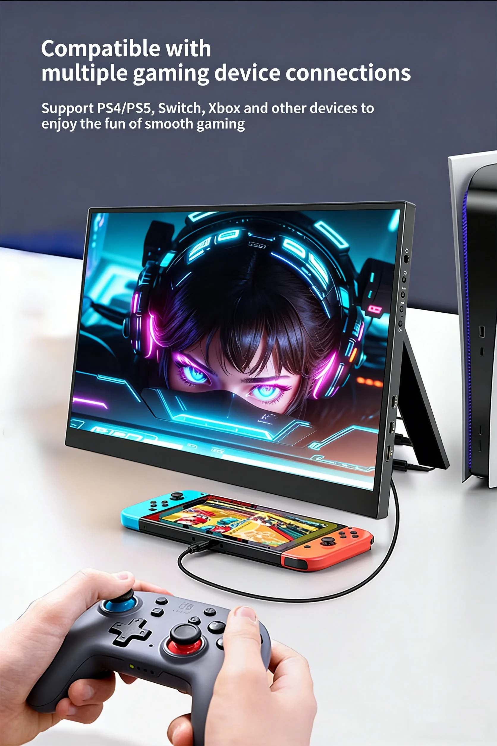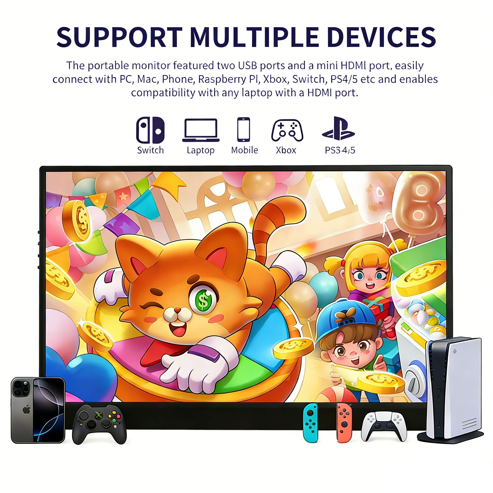4. 1080P 무선 휴대용 모니터 내장 스탠드: 1080P 해상도, 60Hz, 178° 풀 시야각, HDR 및 저블루라이트 초고화질 A급 IPS-ADS 화면을 갖춘 이 FMC 15.6인치 무선 휴대용 모니터는 가로 및 세로 모드에 맞게 각도 조절이 가능한 안정적인 내장 스탠드를 제공하여 높은 생산성을 지원합니다. 참고: 모니터에는 두 개의 VESA 홀이 있으며 VESA 마운팅을 지원합니다.