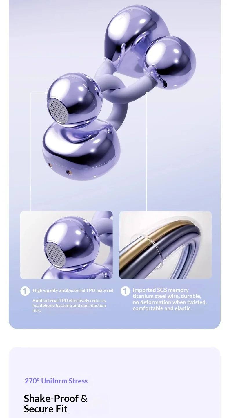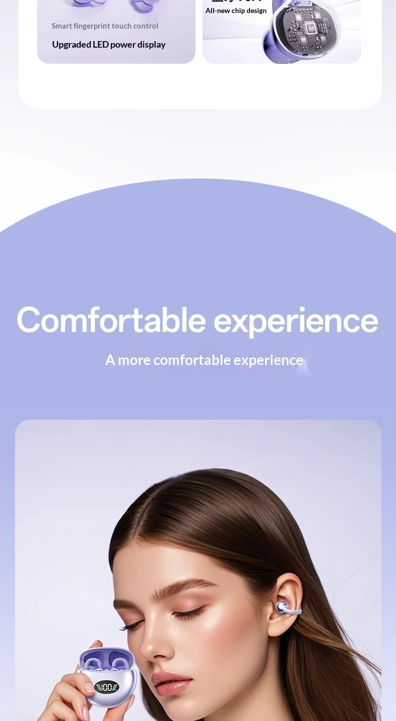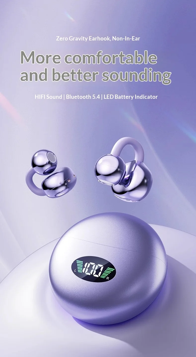 초고급 편안함의 오픈이어 디자인:인체공학적 이어클립 스타일은 귀를 막지 않고 꼭 맞으며, 장시간 착용해도 편안하며, 스포츠, 통근, 사무실 사용 시 안정적인 낙하 방지 기능을 제공합니다.