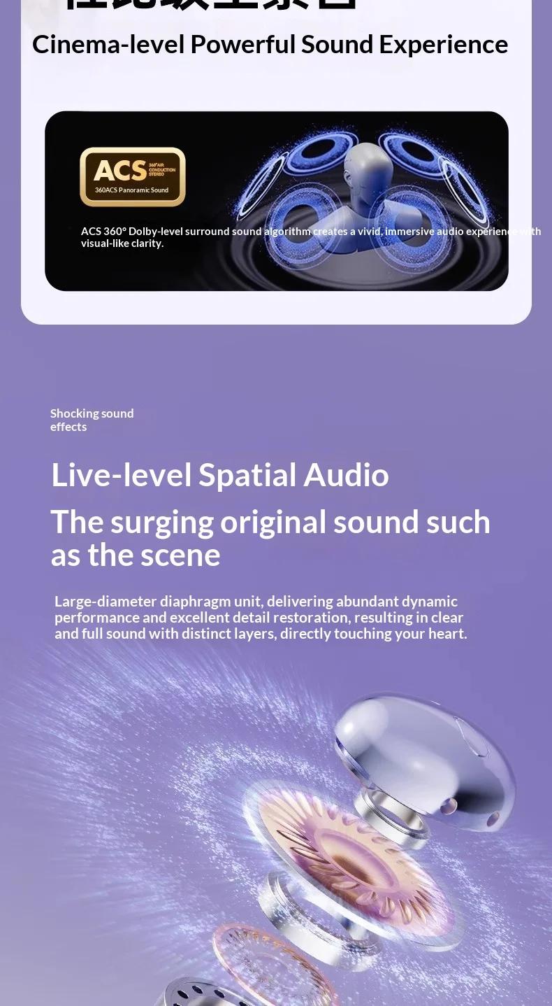 돌비 레벨 360° 몰입형 사운드:ACS 360° 파노라마 사운드 알고리즘으로 구동되어 영화관 수준의 서라운드 사운드를 제공하며, 선명한 음악, 영화, 통화를 경험할 수 있습니다.