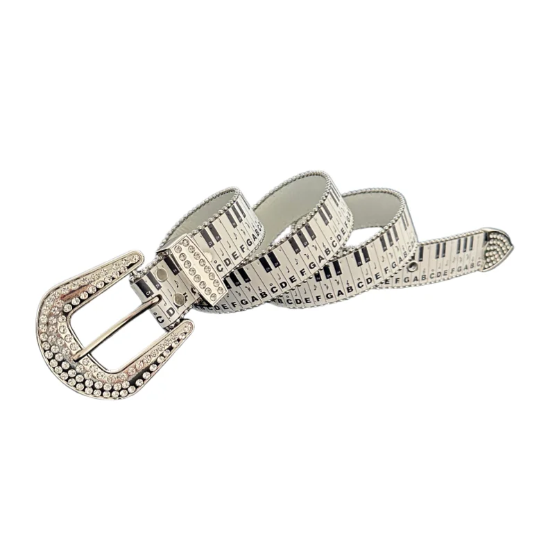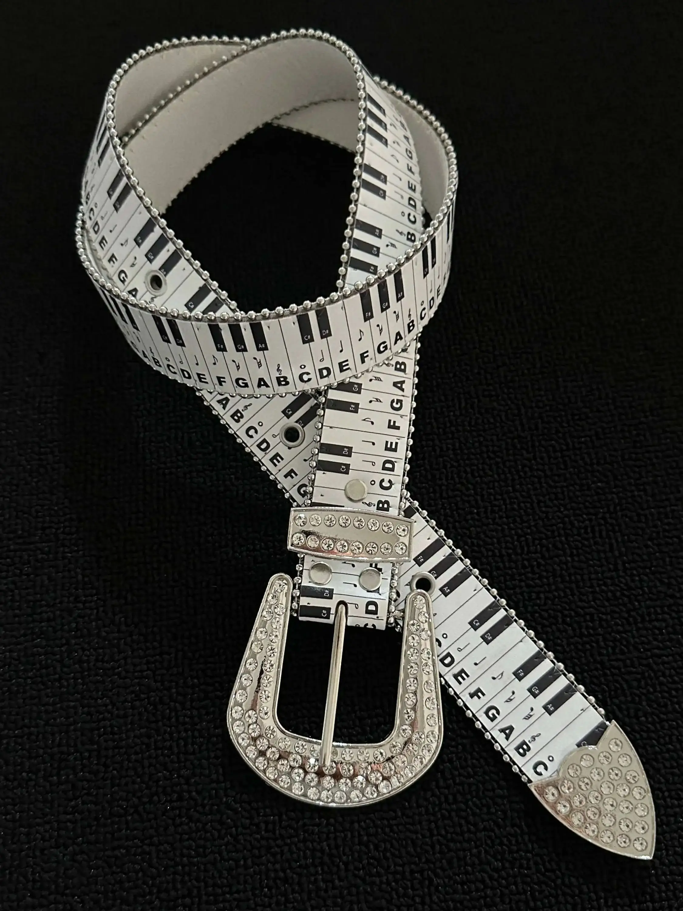 이 벨트의 라인스톤으로 장식된 금속 버클과 피아노 키보드 패턴으로 Y2K 펑크 미학을 수용하세요.