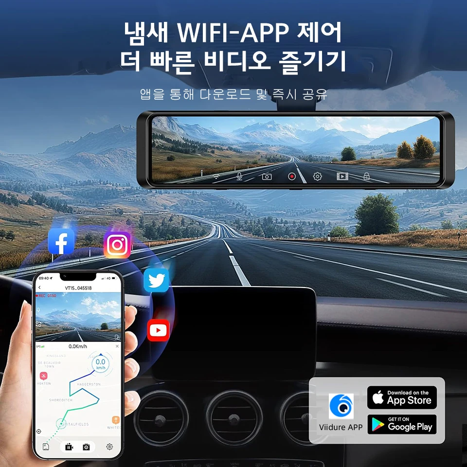 주행과 주차 시 스마트 후방 시야각 전환. 주행 중에는 후방의 모든 차량과 물체를 선명하게 볼 수 있으며, 주차 시에는 자동으로 후방 카메라로 전환되어 더욱 가까운 백업 이미지를 제공합니다.