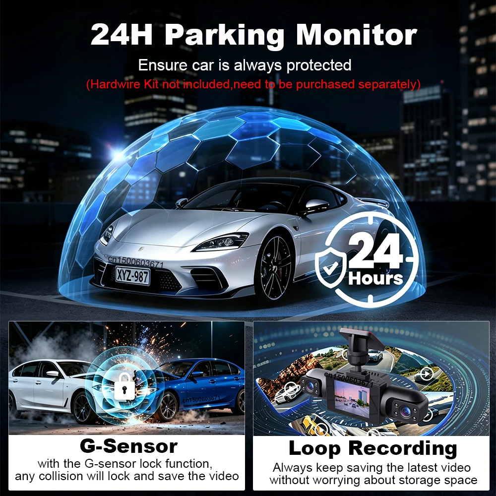 【스마트 주차 모드】차량을 주차하고 시동을 끄면 4채널 대시캠이 자동으로 주차 모드로 전환되어 24시간 감시 녹화를 시작합니다. 차량 앞 3~4미터 범위를 모니터링하여 가까운 물체를 감지하고, 5초 빠른 기동으로 카메라가 자동으로 1분 동안 영상을 녹화하여 차량을 24시간 보호합니다. (참고: 주차 모니터링 기능은 별도의 하드와이어 키트 구매가 필요합니다.)