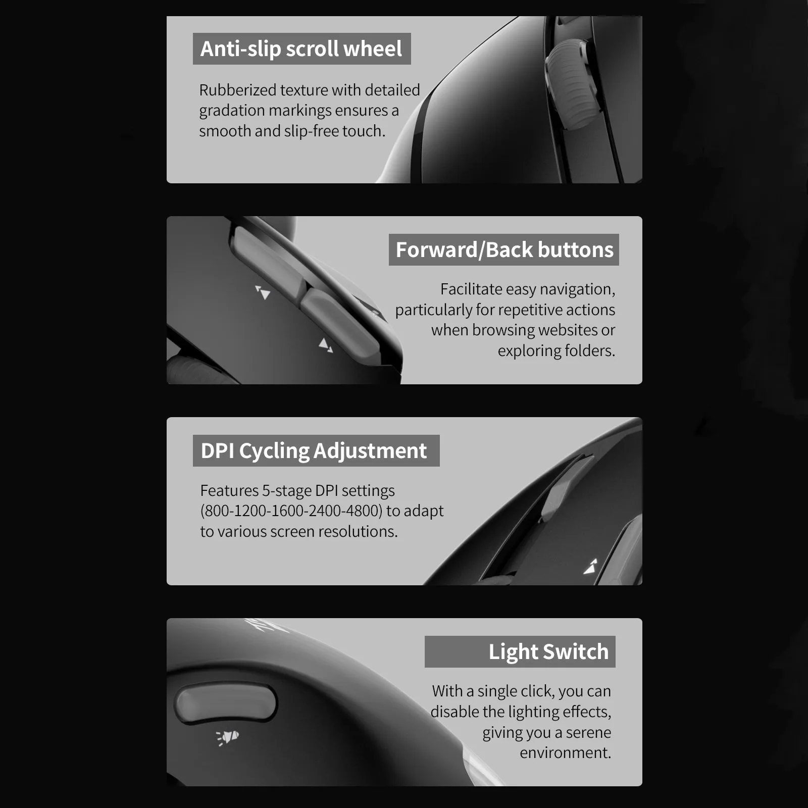 반직립형 인체공학적 그립과 조절 가능한 0°/18° 자석 베이스를 갖춘 이 제품은 모든 손 모양에 맞춰 완벽한 자세를 찾을 수 있도록 설계되었습니다. 5단계로 조절 가능한 DPI(800-1200-1600-2400-4800)는 문서 편집부터 그래픽 디자인까지 부드럽고 정확한 커서 제어를 제공합니다. 8개의 프로그래밍 가능한 버튼, 32KB 온보드 메모리, 맞춤형 드라이버를 통해 단축키, 매크로, 기능을 매핑하여 반복적인 작업을 간소화할 수 있습니다.