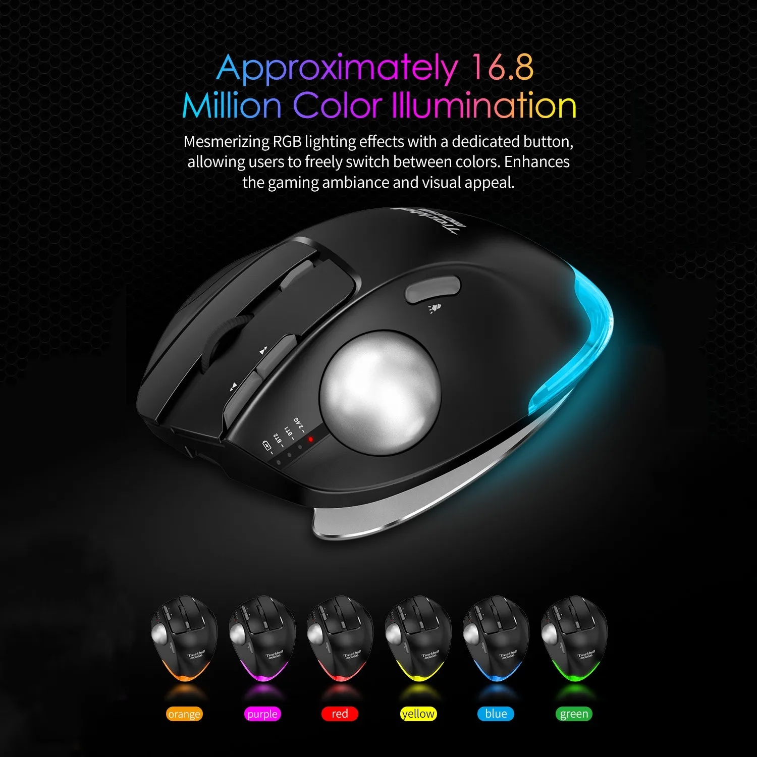 2.4G 무선 연결(10m+ 범위)과 내장된 730mAh 충전식 리튬 배터리를 탑재하여 케이블 없이 오래 사용할 수 있습니다. 전용 온/오프 스위치가 있는 1,680만 가지 RGB 백라이트는 고급스러운 게이밍 미학을 더해주며, 청소가 쉬운 트랙볼은 오랜 기간 동안 일관되고 부드러운 성능을 제공합니다.