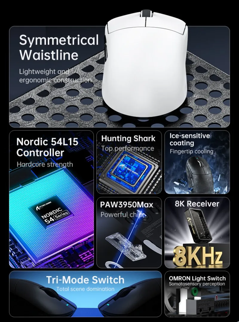 【8K 폴링 속도】무선 및 유선 모드 모두 최대 8KHz의 폴링 속도를 지원하여 낮은 지연 시간, 낮은 전력 소비, 더 빠른 데이터 전송 속도, 그리고 강력한 방해 방지 기능을 제공합니다. 전력 소모 문제에 대한 걱정 없이 최적의 성능을 보장합니다. 더 빠른 트리거 반응으로 더 민감하게 포착된 커서 움직임은 탁월한 성능을 보장하며, 중요한 순간에 승리를 확보할 수 있도록 도와줍니다!