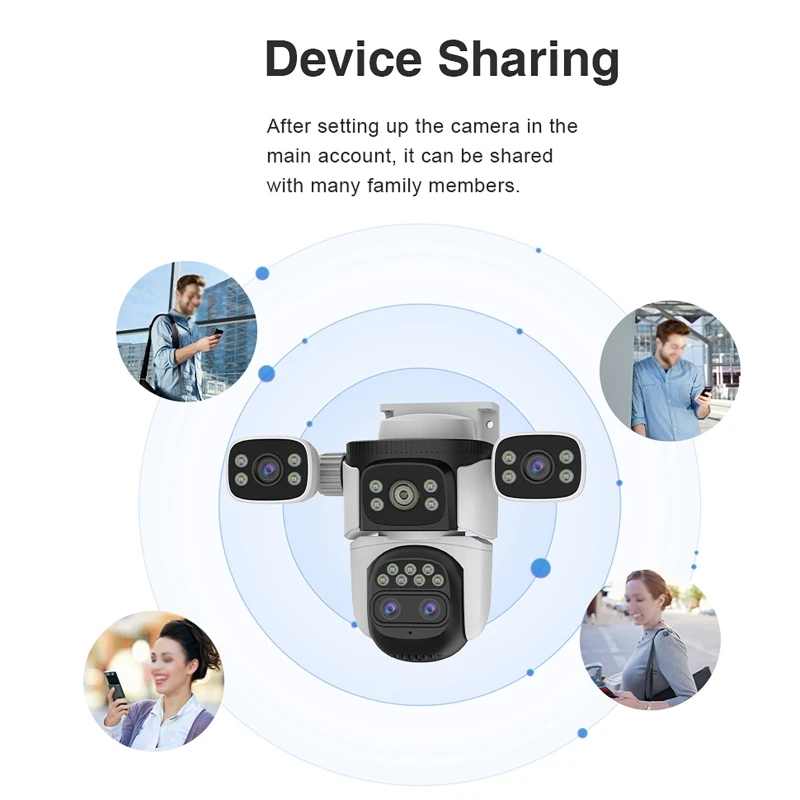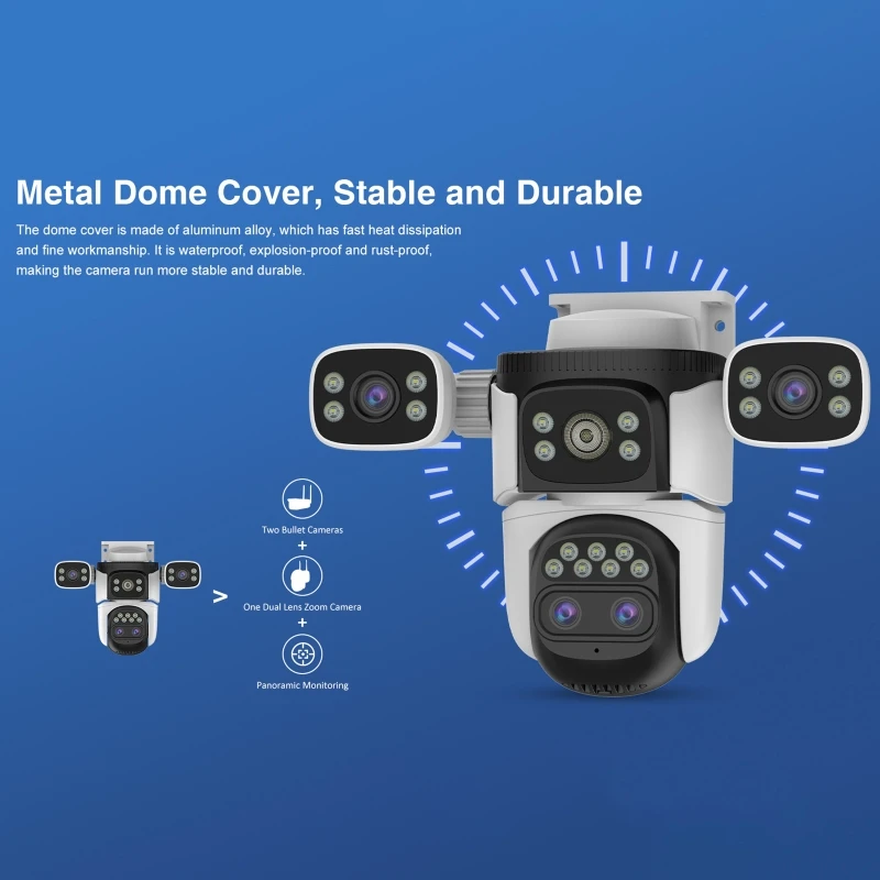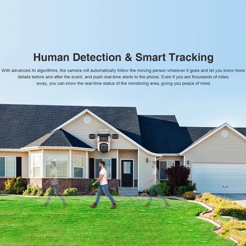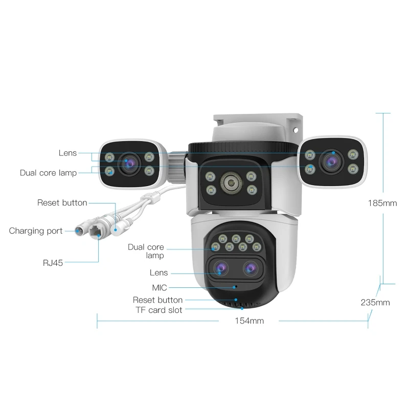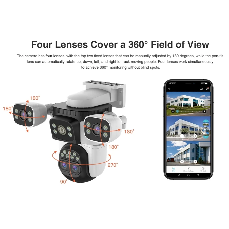 ***4렌즈 4화면 디자인: 이 CCTV 카메라는 네 개의 이미지를 실시간으로 모니터링할 수 있습니다. 첫 번째 이미지는 팬틸트 카메라로, 두 번째, 세 번째, 네 번째 렌즈 이미지는 고정 위치 카메라입니다. 영상에서 확대하고 싶은 고정 위치 카메라를 클릭하면 팬틸트 카메라가 지정된 위치로 이동합니다.