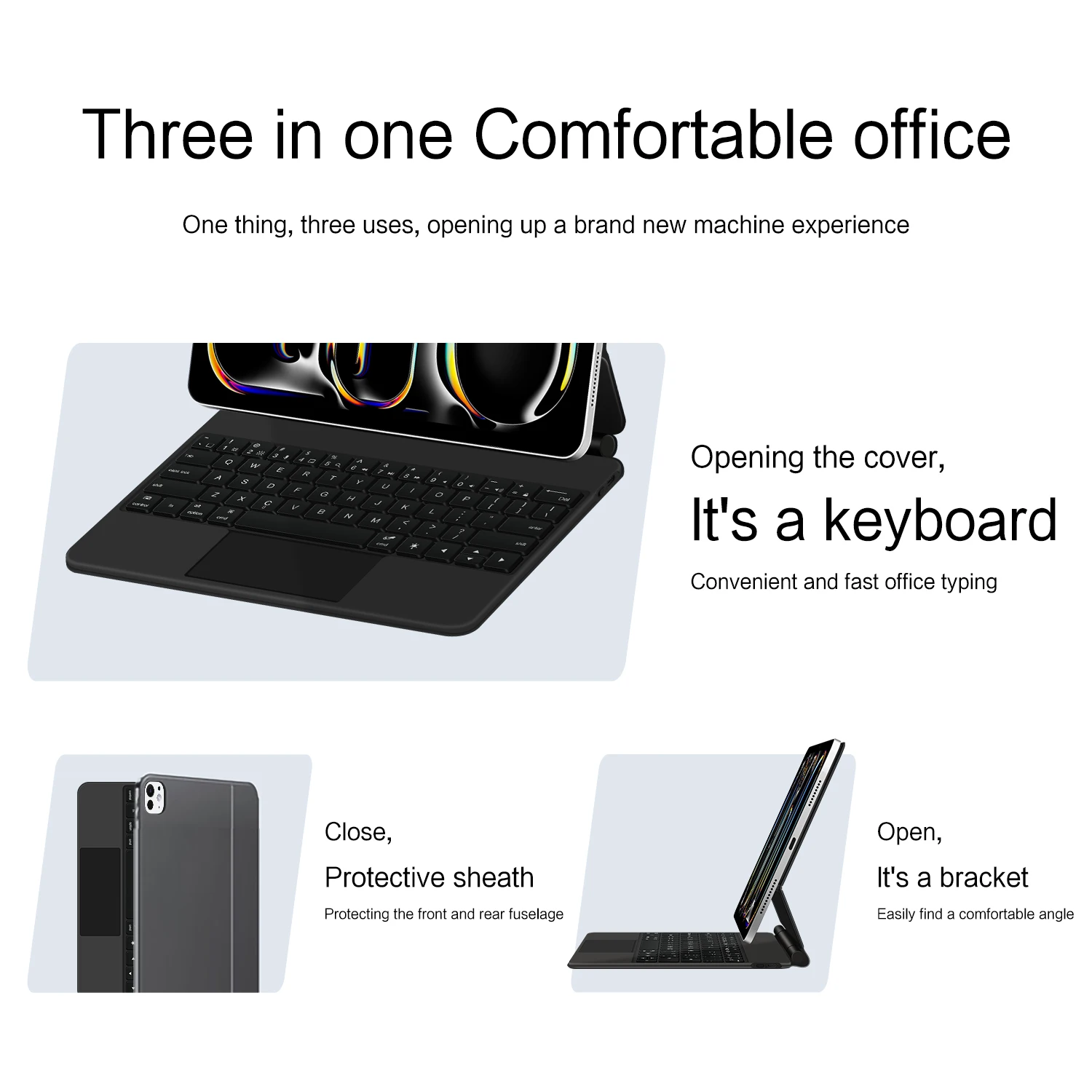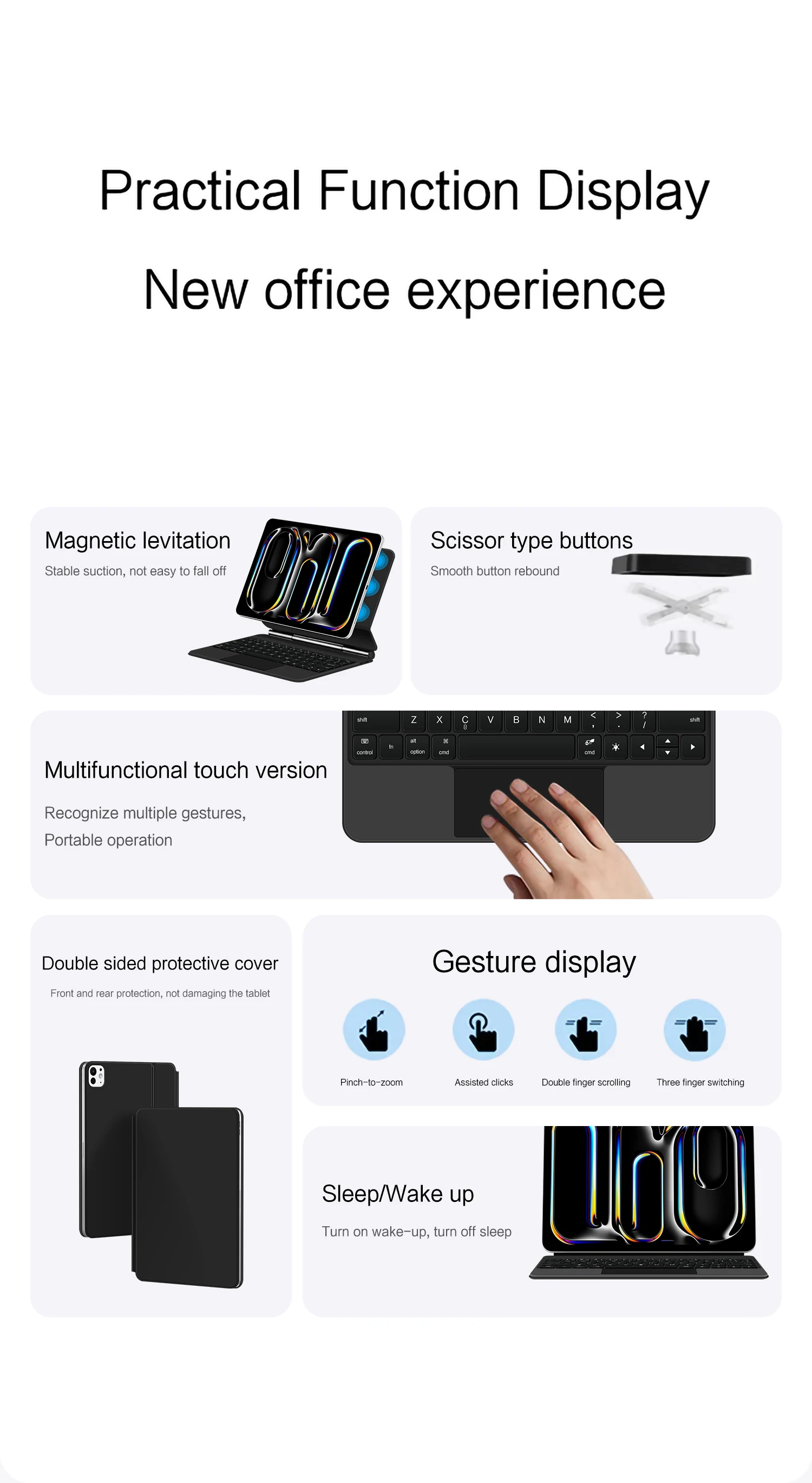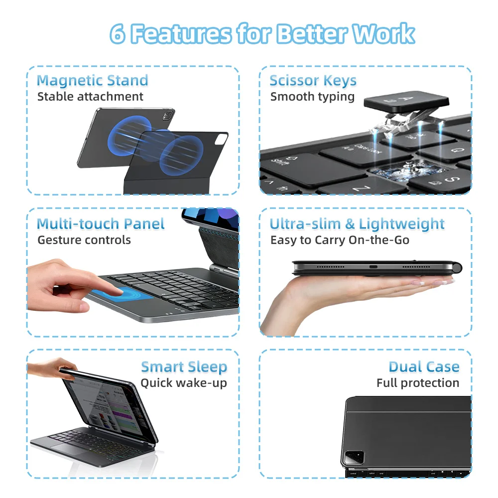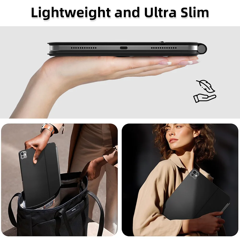 * 마그네틱 플로팅 디자인 - iPad를 위해 설계된 이 키보드는 강력한 자석 고정 기능을 갖추고 있어 안전성과 안정성을 보장합니다. 인체공학적으로 조절 가능한 각도를 통해 iPad를 원하는 각도로 기울일 수 있습니다. 또한, 마그네틱 개폐 시스템은 iPad의 자동 절전 및 화면 켜짐 기능을 활성화합니다.