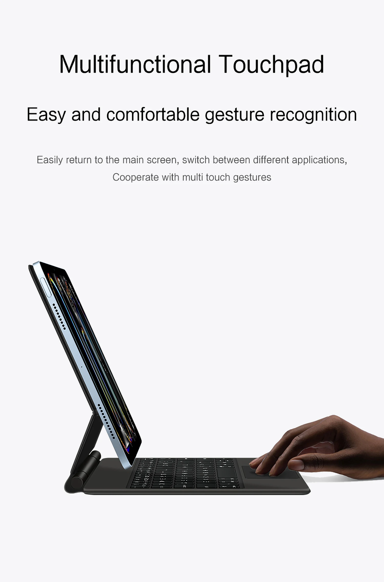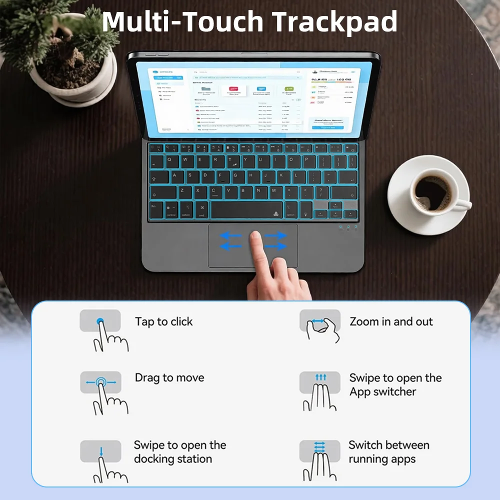 정밀하고 다기능적인 터치패드 - 아이패드 키보드는 고정밀 트랙패드를 포함하고 있어 멀티터치 동작에 유연하게 반응합니다. 스크롤, 스크롤 및 애플리케이션 전환을 손쉽게 수행하여 사용 경험을 최대한으로 최적화합니다.