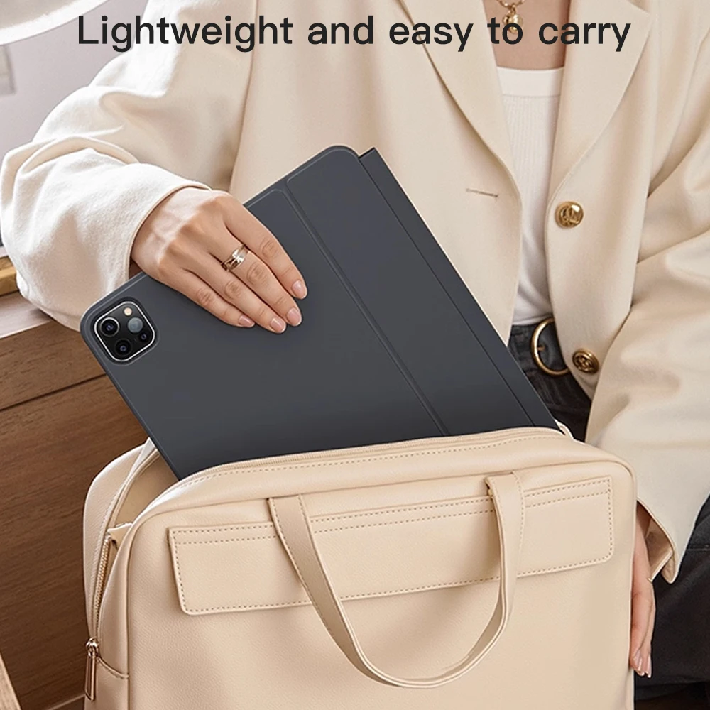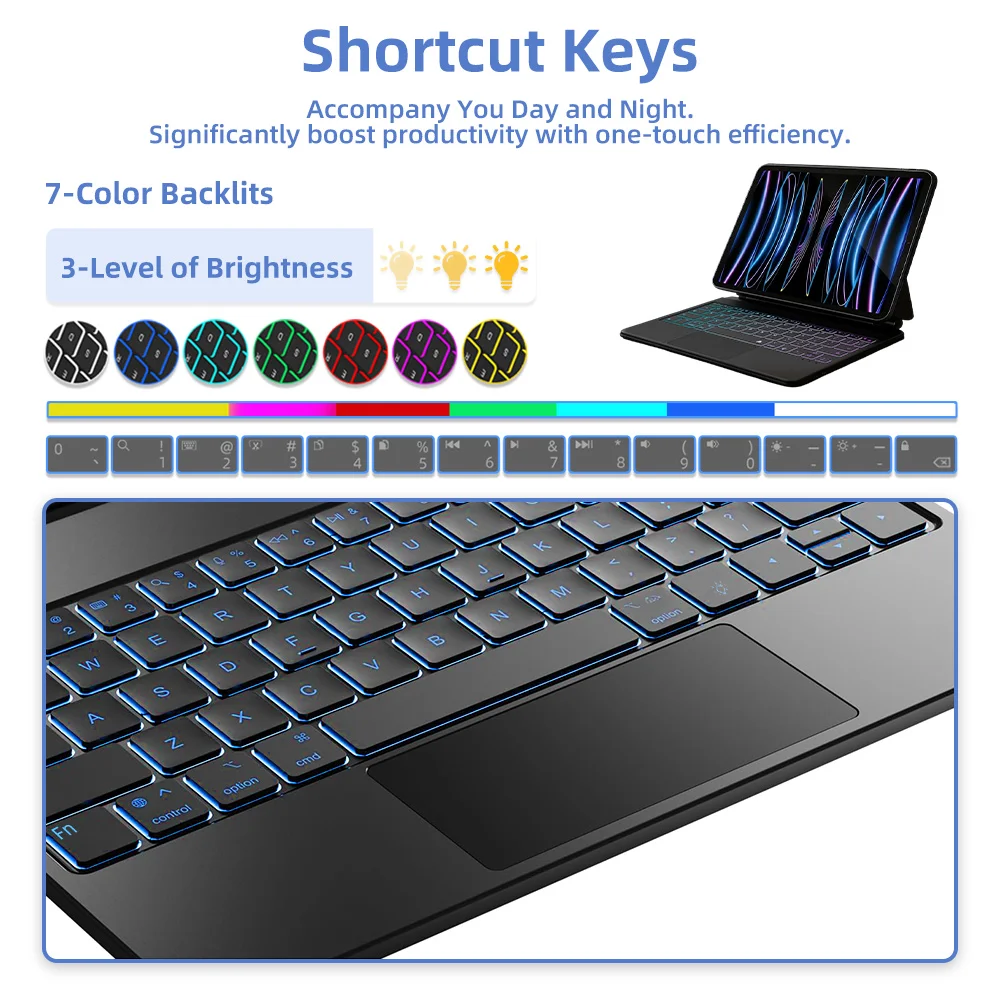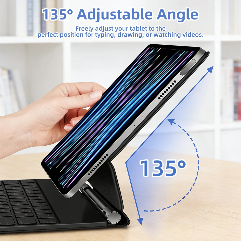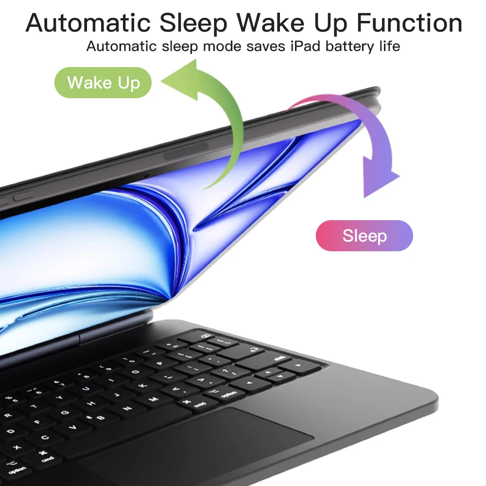 * 마그네틱 플로팅 디자인 - iPad를 위해 설계된 이 키보드는 강력한 자석 고정 기능을 갖추고 있어 안전성과 안정성을 보장합니다. 인체공학적으로 조절 가능한 각도를 통해 iPad를 원하는 각도로 기울일 수 있습니다. 또한, 마그네틱 개폐 시스템은 iPad의 자동 절전 및 화면 켜짐 기능을 활성화합니다.