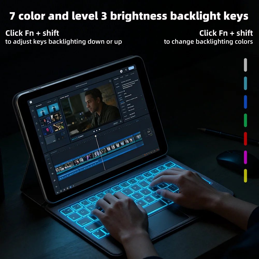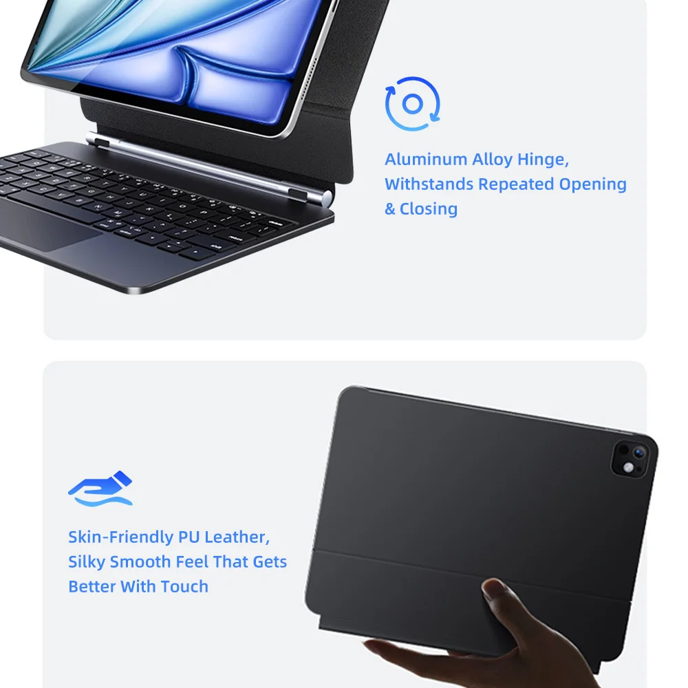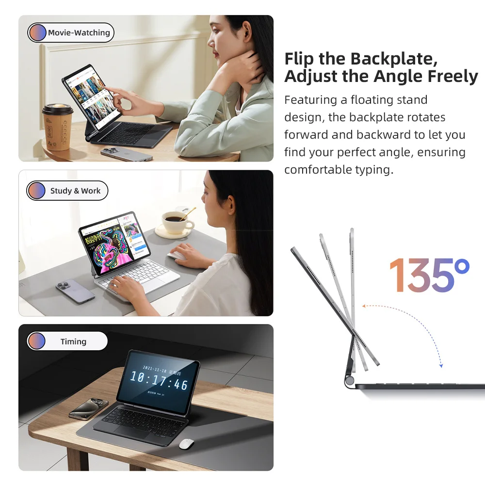 * 마그네틱 플로팅 디자인 - iPad를 위해 설계된 이 키보드는 강력한 자석 고정 기능을 갖추고 있어 안전성과 안정성을 보장합니다. 인체공학적으로 조절 가능한 각도를 통해 iPad를 원하는 각도로 기울일 수 있습니다. 또한, 마그네틱 개폐 시스템은 iPad의 자동 절전 및 화면 켜짐 기능을 활성화합니다.