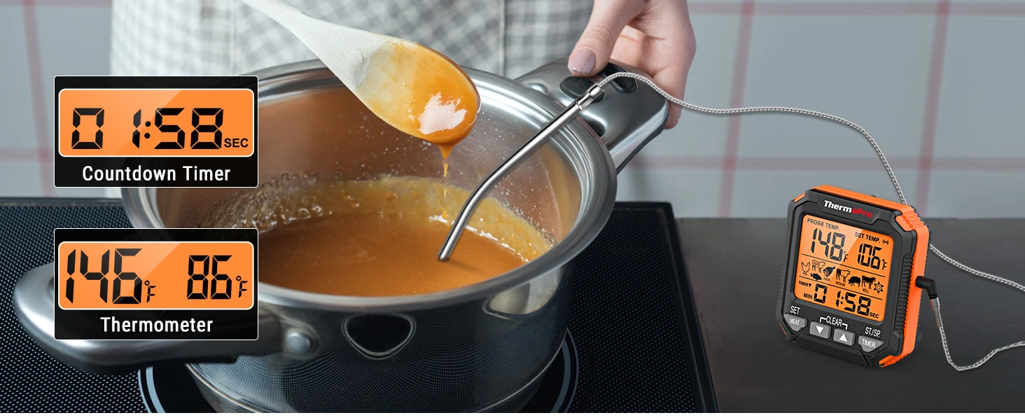 온도계에는 최대 99분 59초까지 카운트다운 기능이 있으며, 설정된 시간에 도달하면 알람이 울립니다.
