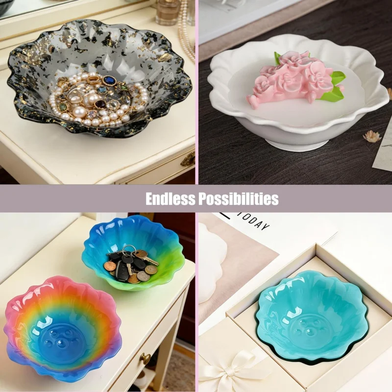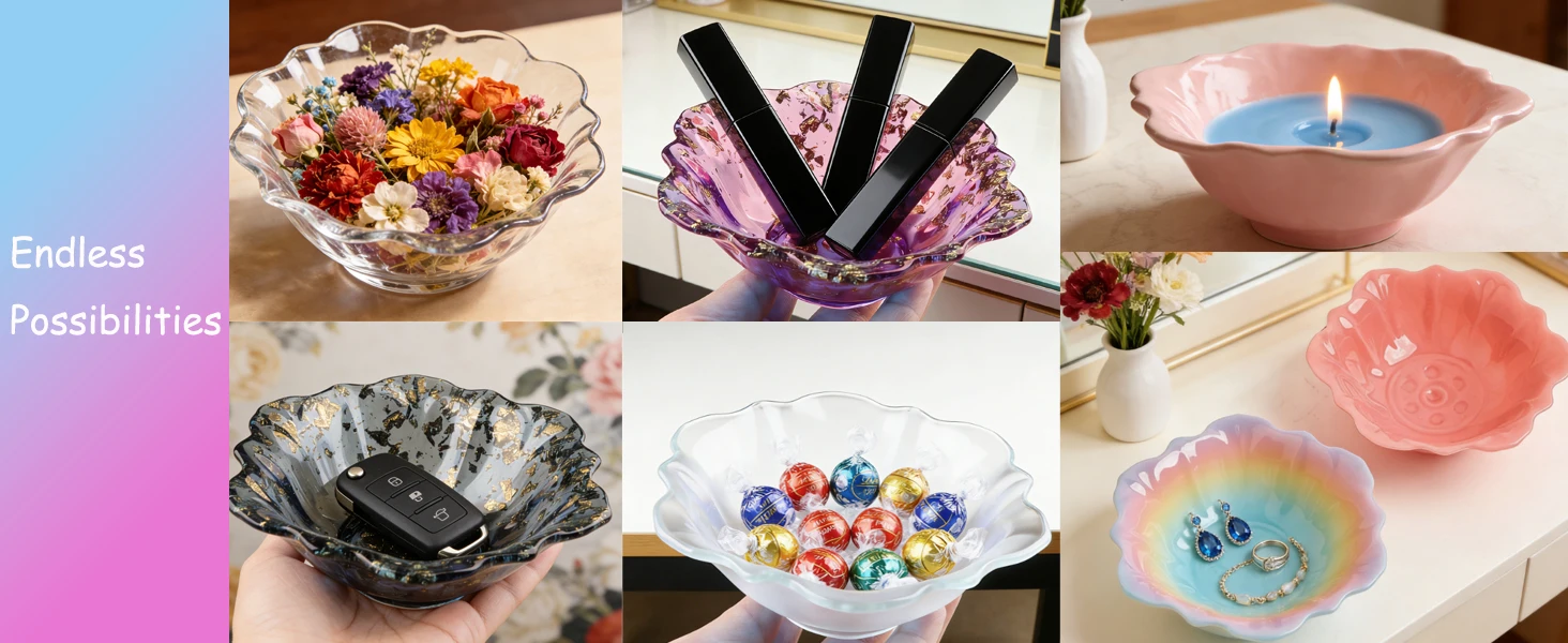 이 몰드는 에폭시 레진, UV 레진, 콘크리트, 점토, 석고 등 대부분의 주조 재료와 호환됩니다. 이상적인 크기로 맞춤형 주얼리 접시, 장식품 트레이, 캔들 홀더, 비누 받침, 또는 독특한 캔디 볼을 만드는 데 완벽합니다. 마음껏 창의력을 발휘해 보세요!