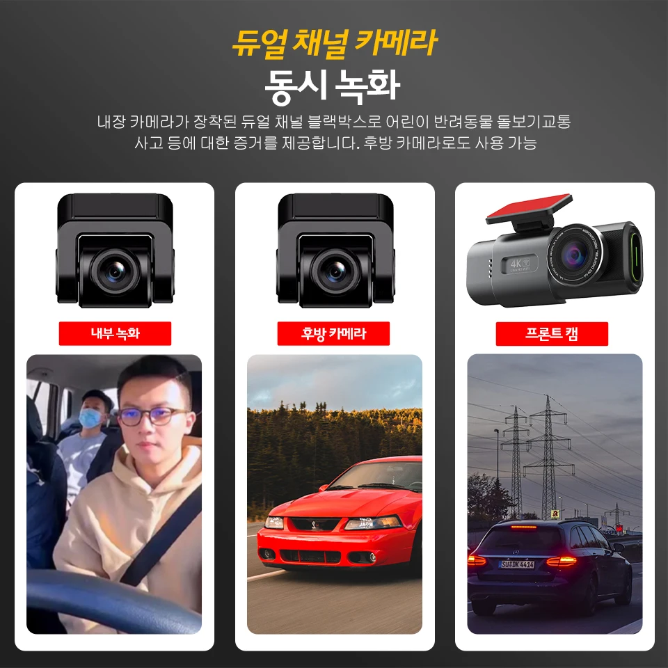 후방 렌즈를 뒷유리에 설치하여 차량 후방을 녹화할 수도 있고, 앞유리에 후방 렌즈를 설치하여 차량 내부를 녹화할 수도 있습니다.