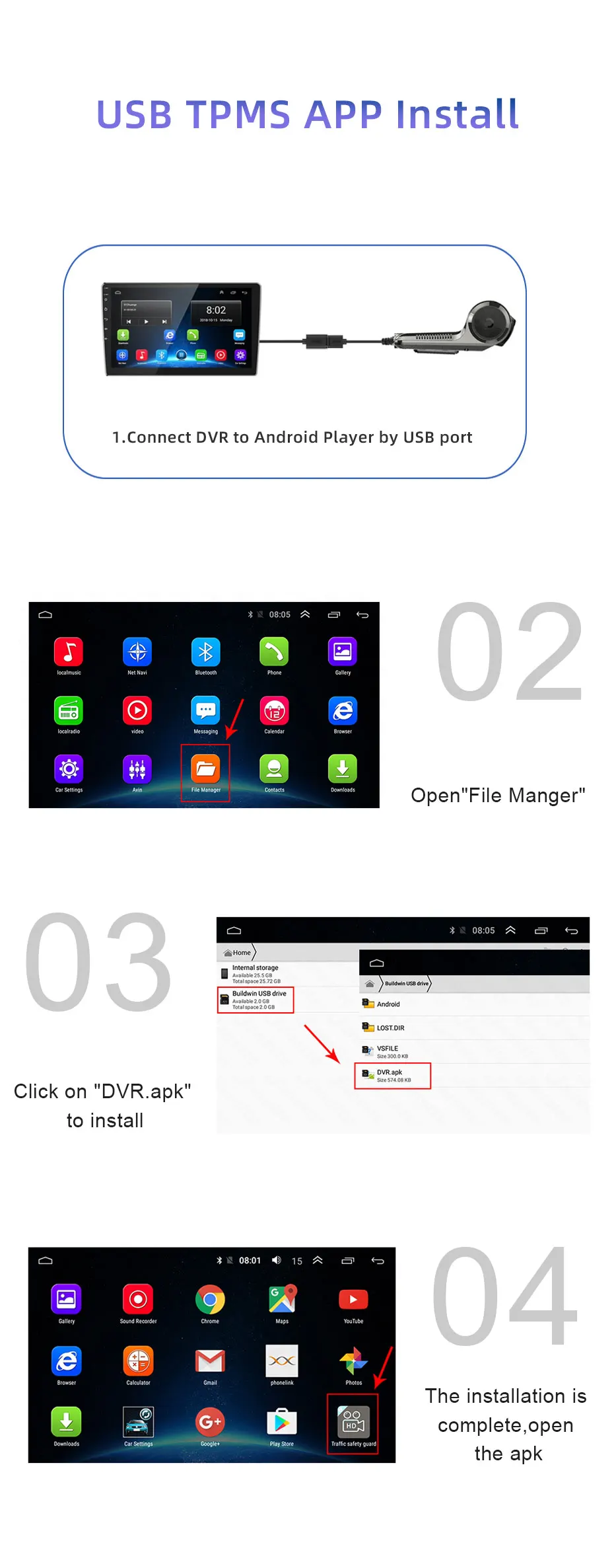 A: 저희는 DVR에 애플리케이션을 재설치했습니다. 차량 라디오에 연결한 후 파일 관리자에 들어가서 Buildwin USB 드라이브를 찾고, 클릭하여 들어간 다음 "DVR.apk"를 실행하여 설치를 완료하세요.