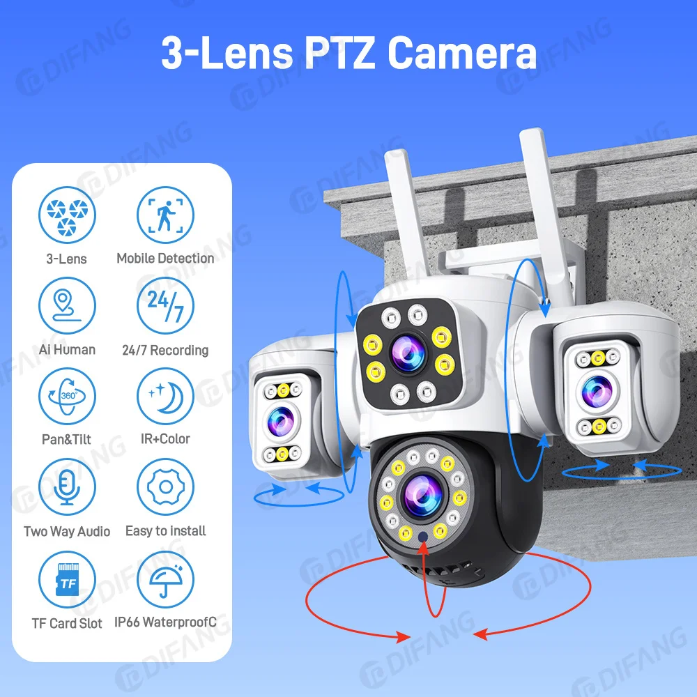 【트리플 렌즈 + 트리플 스크린 디스플레이】1개의 PTZ 팬틸트 렌즈 + 2개의 고정 렌즈; 앱은 3개의 피드를 모두 동시에 표시하여 하나의 카메라로 3개의 카메라를 모두 감시할 수 있어 사각지대 없는 포괄적인 모니터링이 가능합니다.