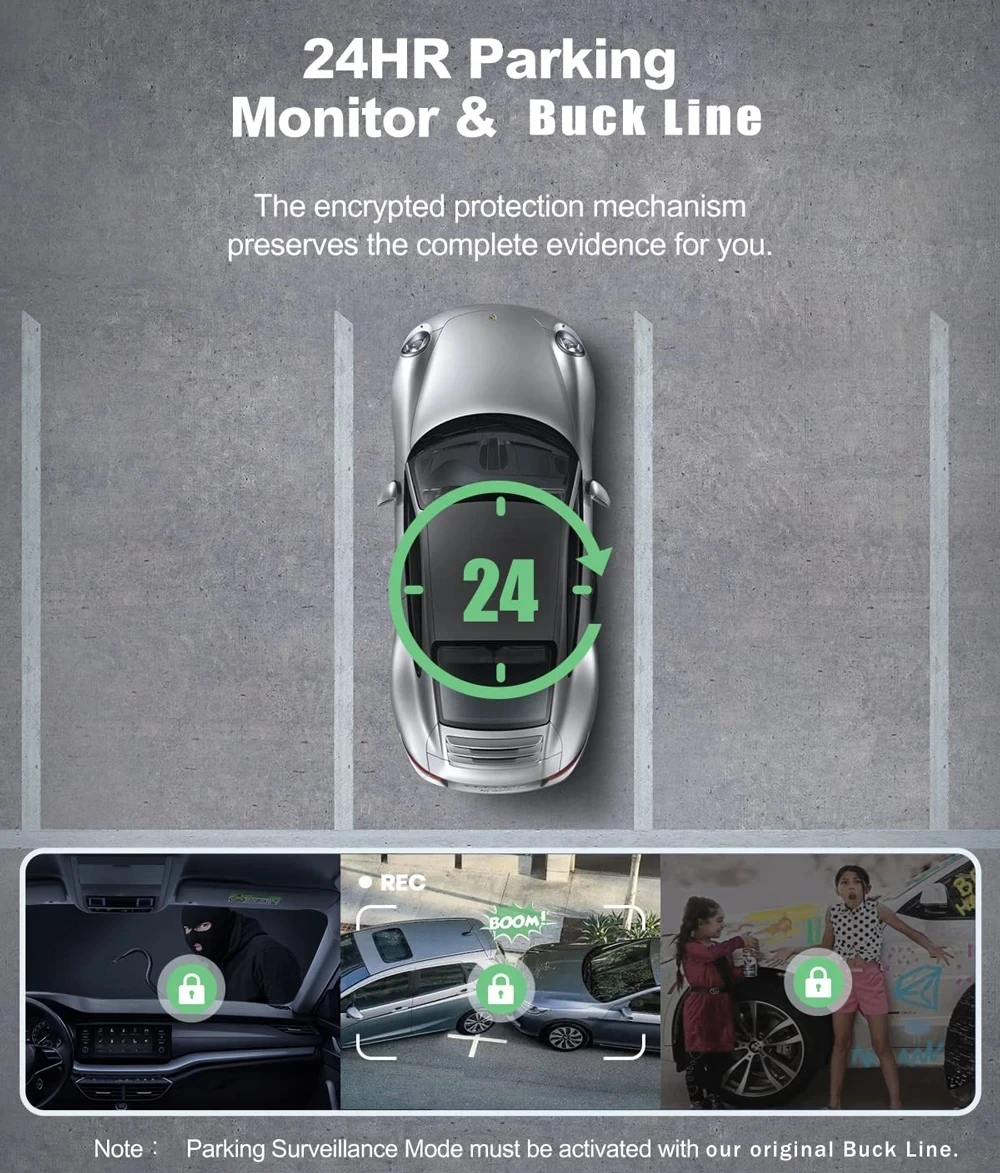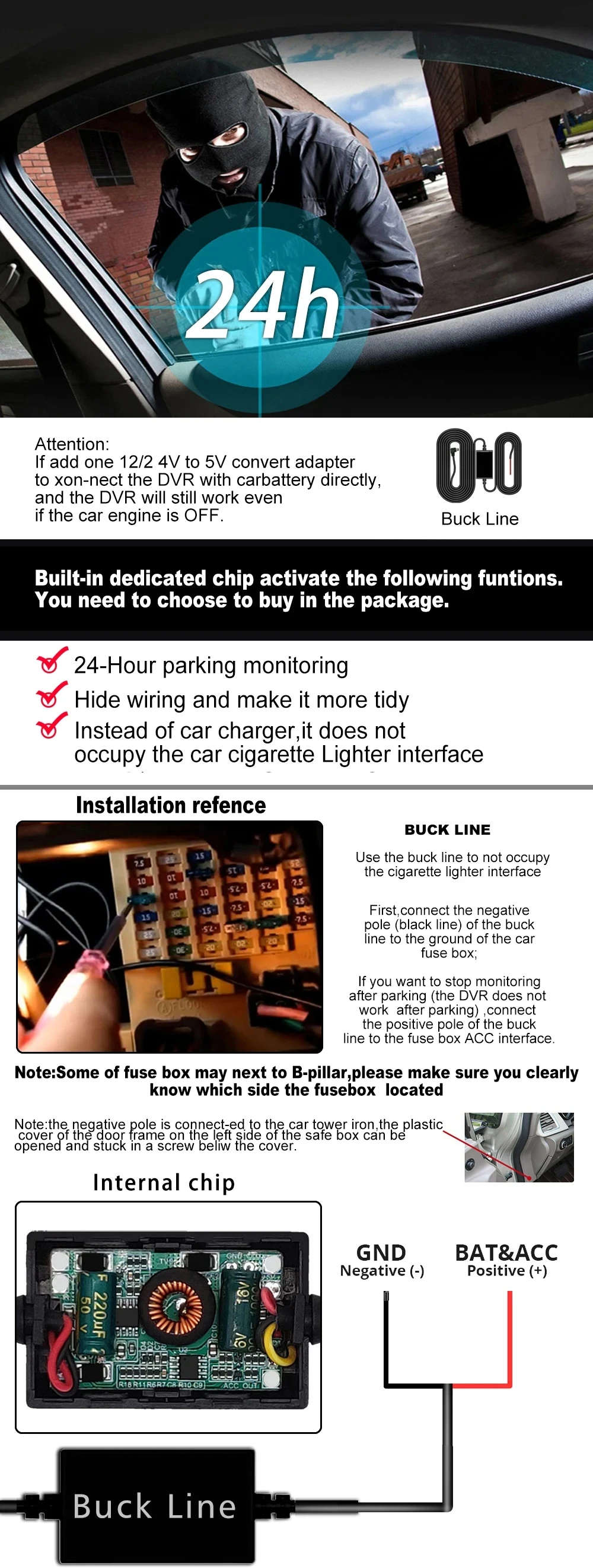 24시간 주차 모니터링 기능이 필요하다면, 해당 Buck Line 액세서리를 주문하여 차량 충전기를 교체할 수 있습니다. Buck Line을 통해 DVR 전원을 차량 배터리 또는 ACC에서 직접 공급받을 수 있어, 차량이 꺼진 상태에서도 DVR이 정상적으로 녹화 작업을 유지할 수 있습니다. (차량 모델에 따라 배터리 인터페이스나 ACC 인터페이스가 다르기 때문에, 직접 설치하는 것은 권장하지 않습니다. 전문가에게 Buck Line 설치를 의뢰하는 것을 추천합니다.)