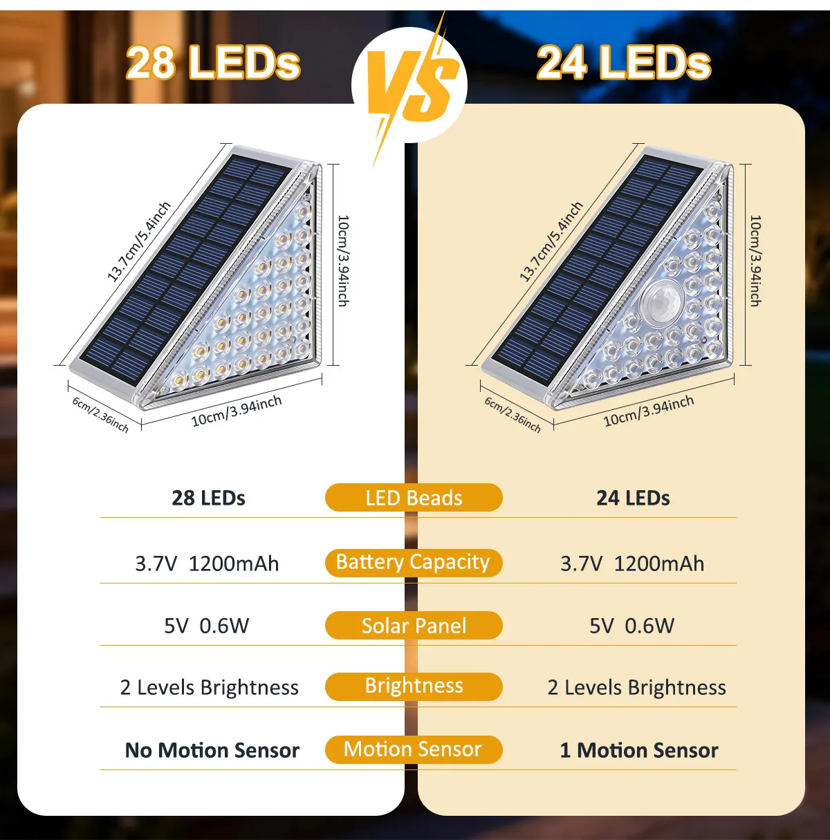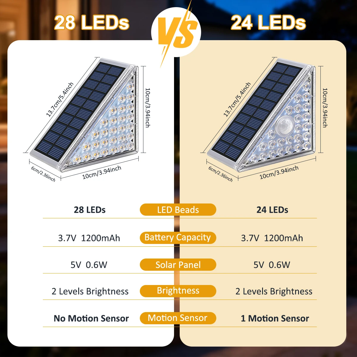 【당신의 필요를 충족시키는 두 가지 스마트 조명 옵션】--28LED 상시 점등 모델을 선택하여 해질녘부터 새벽까지 지속적인 조명을 제공하거나, 24LED 모션 센서 모델을 선택하여 움직임이 감지될 때만 활성화되고 짧은 시간 후 자동으로 꺼져 배터리 전력을 절약하며 장시간 사용할 수 있습니다.