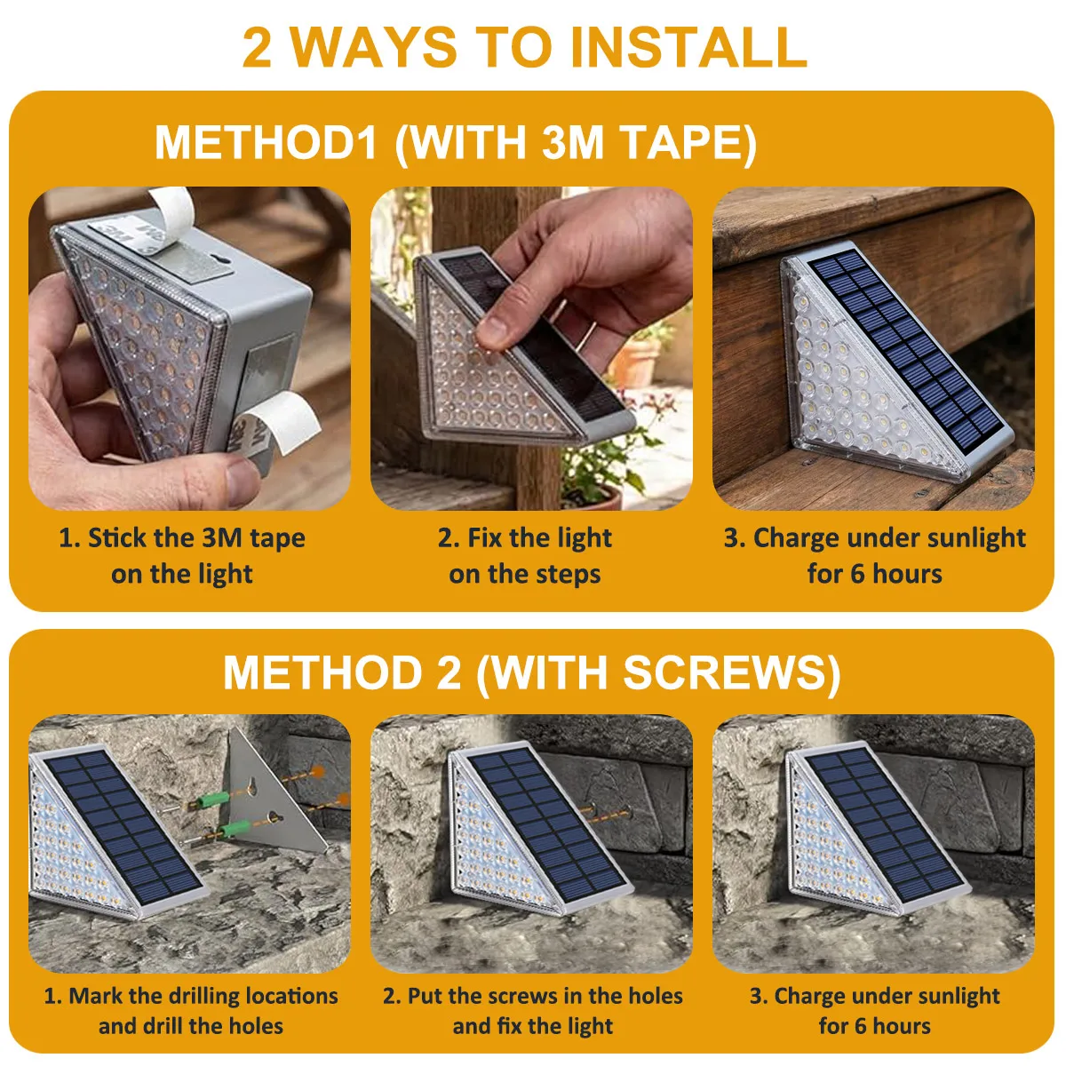 【다양한 야외 활용을 위한 다재다능한 삼각형 디자인】--세련된 삼각형 모양은 모서리에 자연스럽게 어우러지며 계단 가장자리, 계단, 데크 난간, 울타리, 정원 길 등에 완벽하게 맞습니다. 이 태양광 조명은 현관, 정문, 보도, 파티오 등 모든 야외 공간에 안전성과 스타일을 더해줍니다. 배선이 필요 없으며, 설치만 하면 손쉽게 태양광 조명을 즐길 수 있습니다.