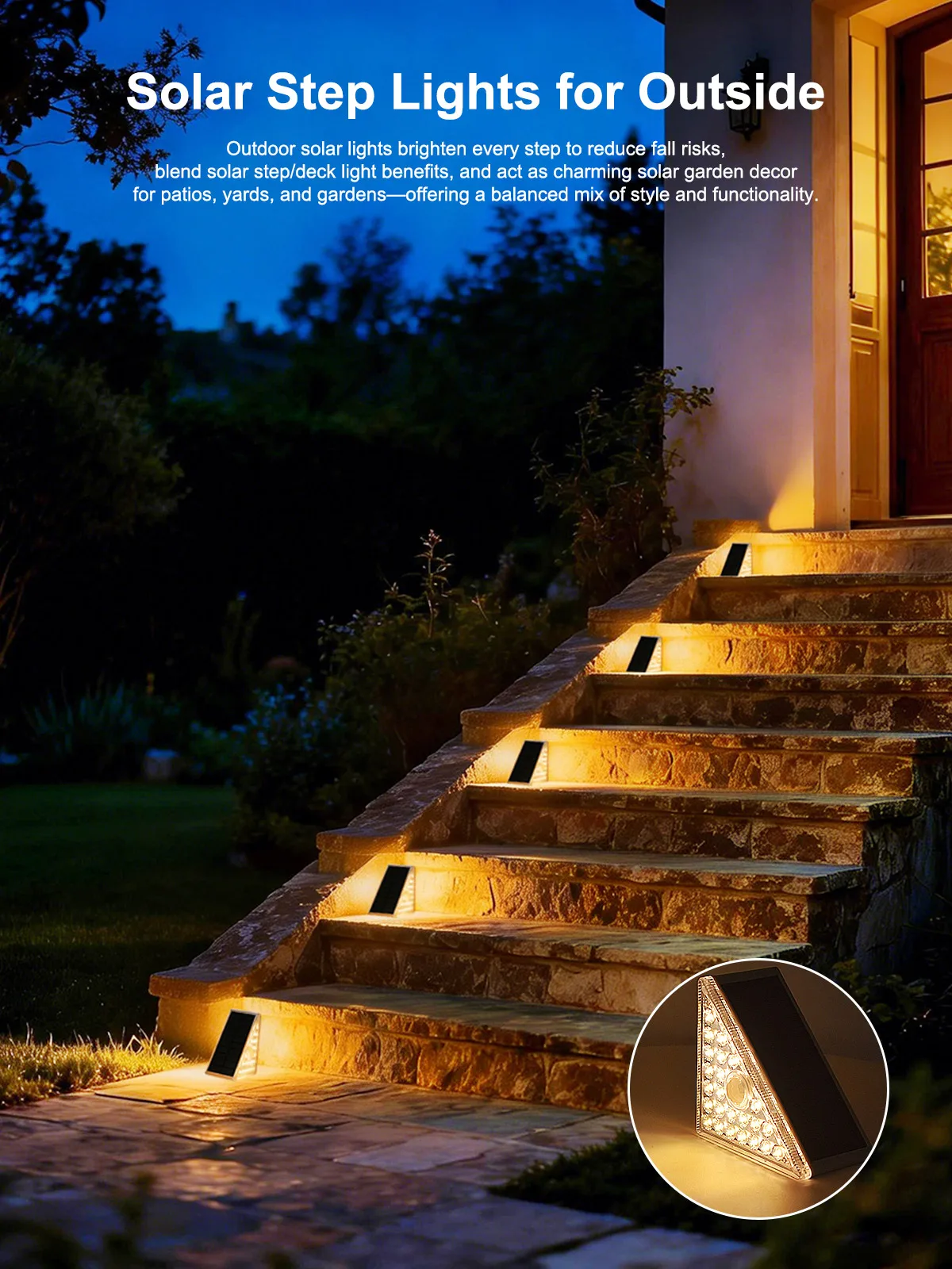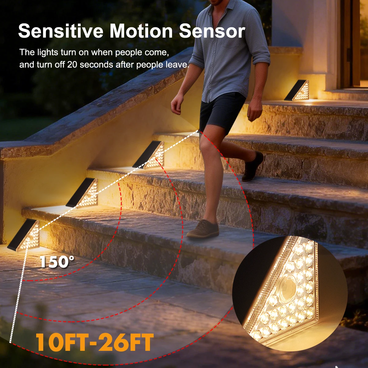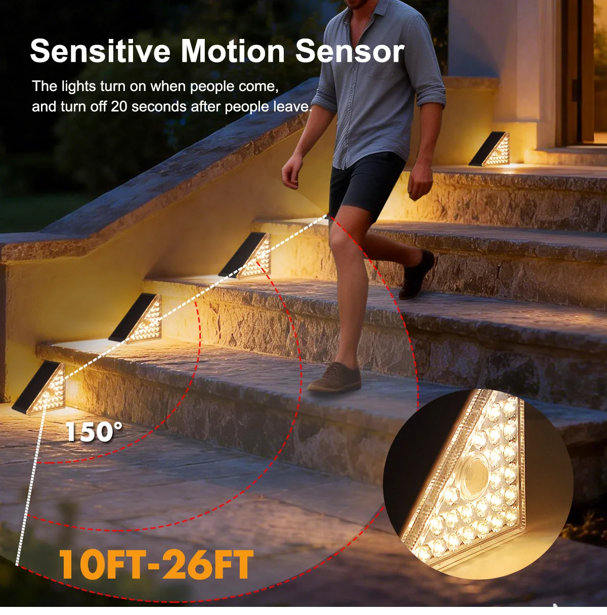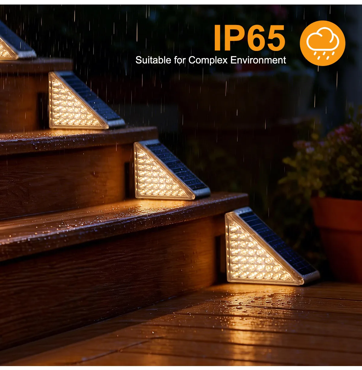 【IP65 방수 등급으로 모든 날씨에 견디는 내구성】--전문적인 IP65 방수 및 방진 등급을 갖춘 이 태양광 계단 조명은 비, 눈, 서리, 극한 온도 등 가혹한 야외 환경을 견딜 수 있도록 설계되었습니다. 어떤 날씨에서도 안정적으로 작동하여 계단, 데크, 울타리, 파티오 등 장기적인 야외 설치에 적합합니다.