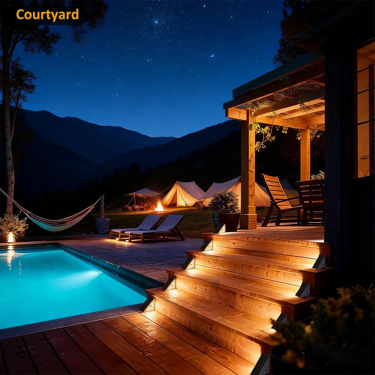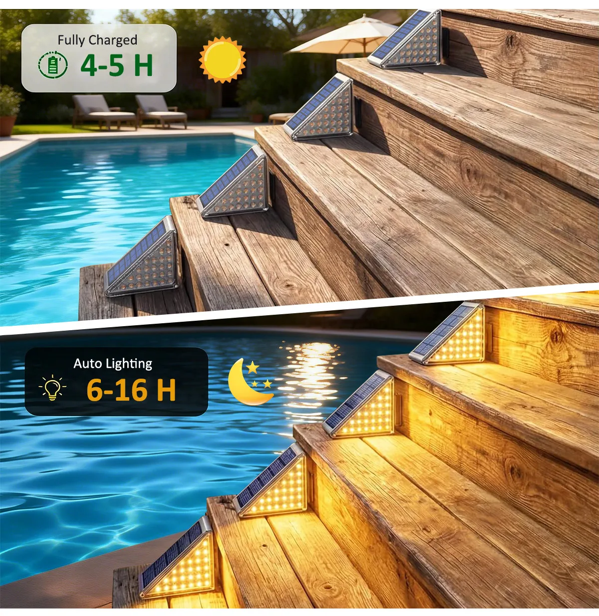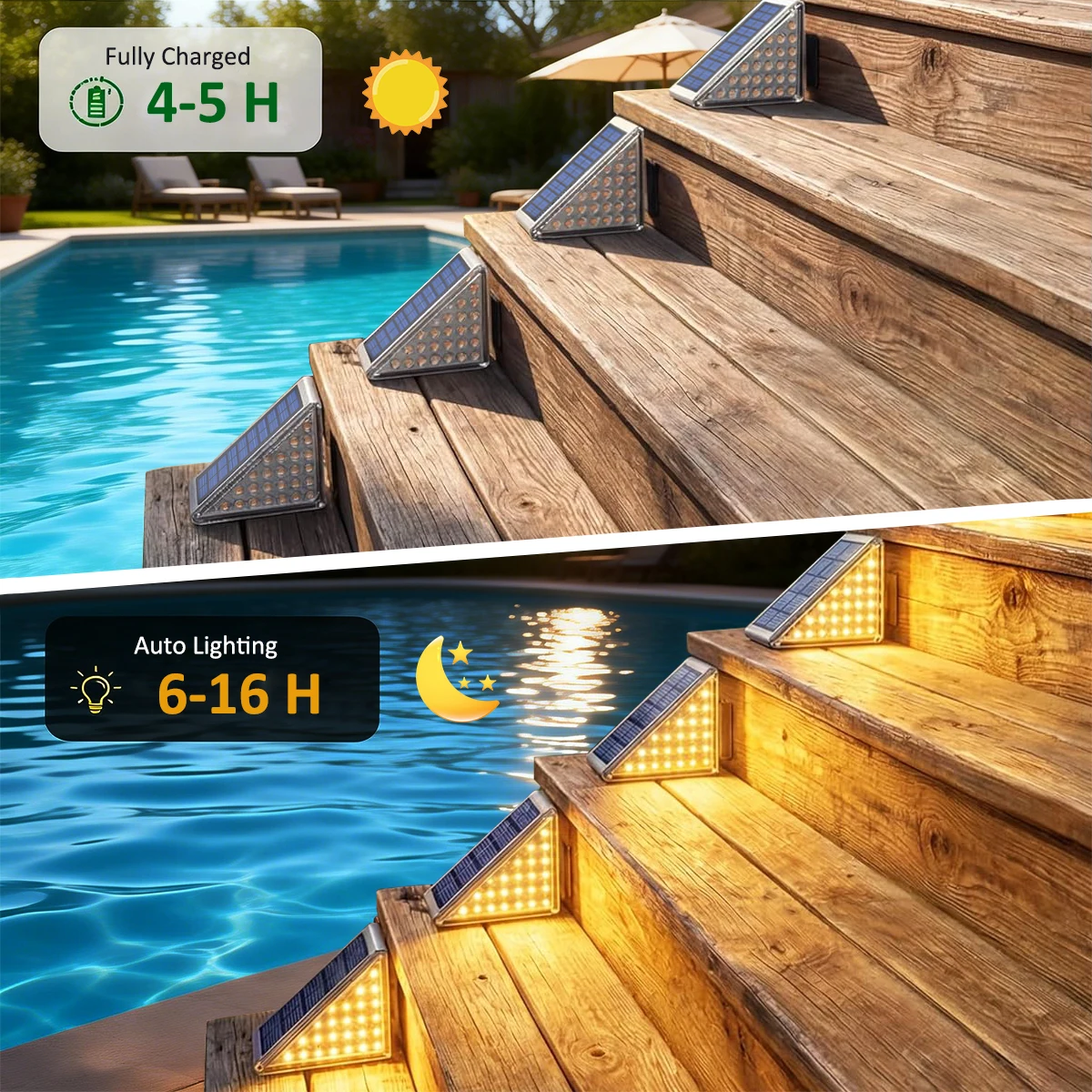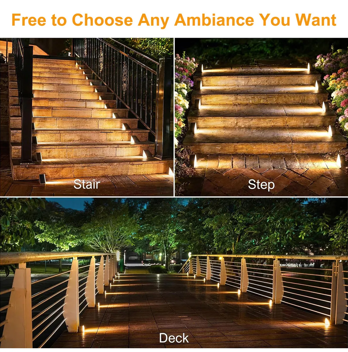 【IP65 방수 등급으로 모든 날씨에 견디는 내구성】--전문적인 IP65 방수 및 방진 등급을 갖춘 이 태양광 계단 조명은 비, 눈, 서리, 극한 온도 등 가혹한 야외 환경을 견딜 수 있도록 설계되었습니다. 어떤 날씨에서도 안정적으로 작동하여 계단, 데크, 울타리, 파티오 등 장기적인 야외 설치에 적합합니다.