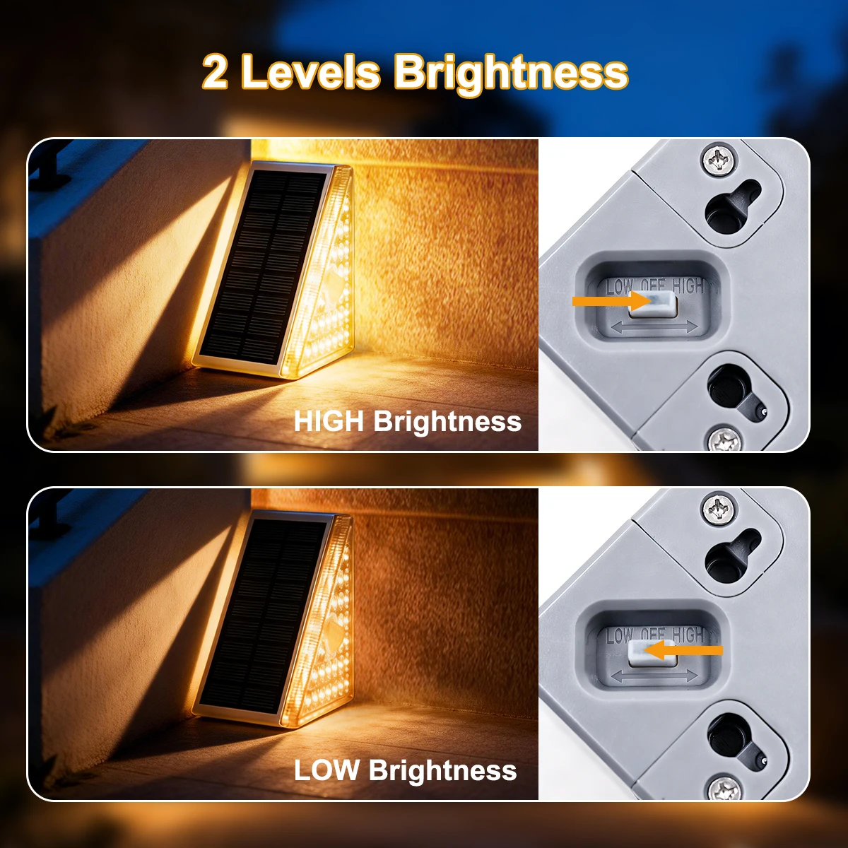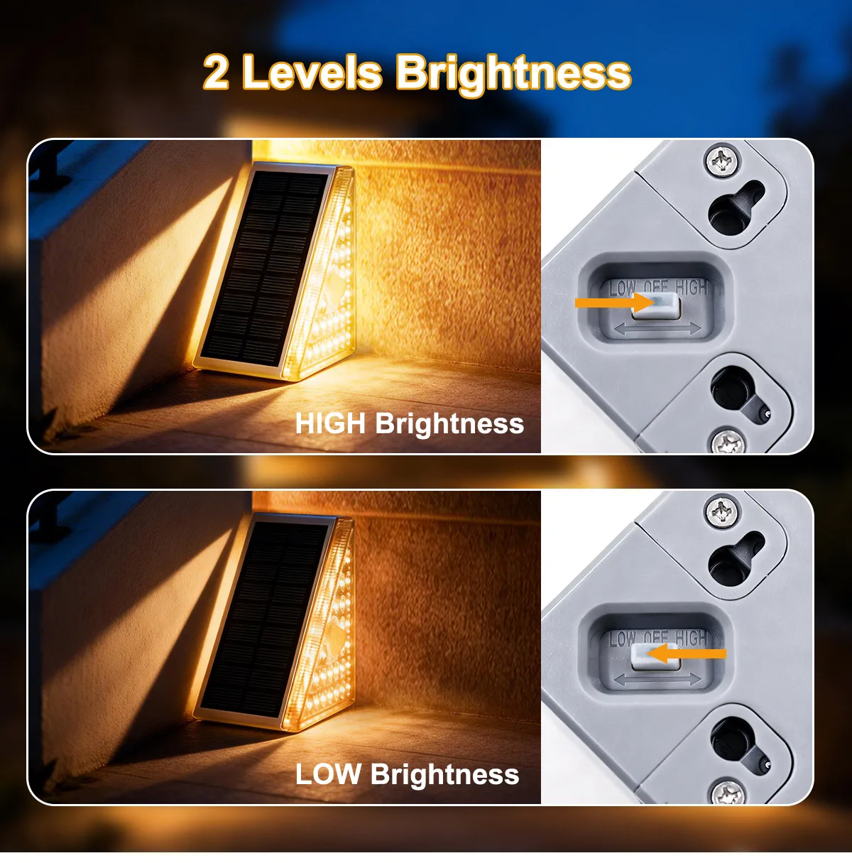 【조명 맞춤 설정을 위한 이중 밝기 레벨】--언제든지 조명 요구에 맞게 높은 밝기 모드와 낮은 밝기 모드를 선택하세요. 높은 모드는 최대 조명을 제공하여 가시성과 안전성을 강화하며, 낮은 모드는 부드러운 분위기 조명을 제공하여 배터리 전력을 절약하고 더 긴 사용 시간을 제공합니다.