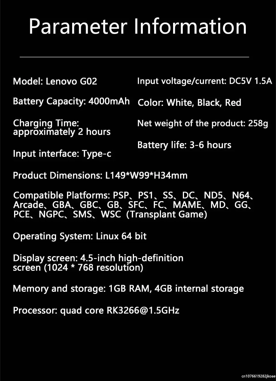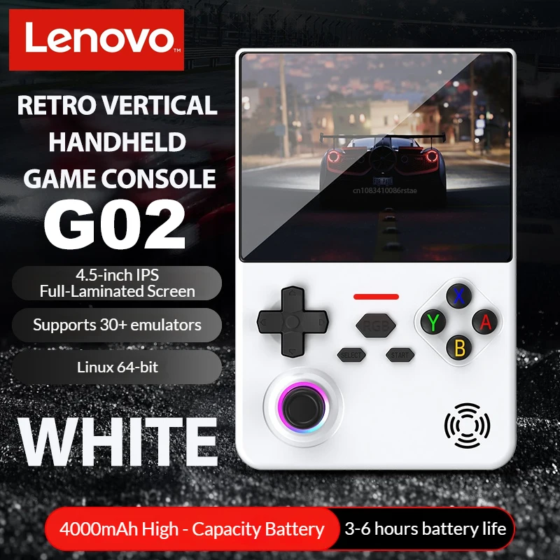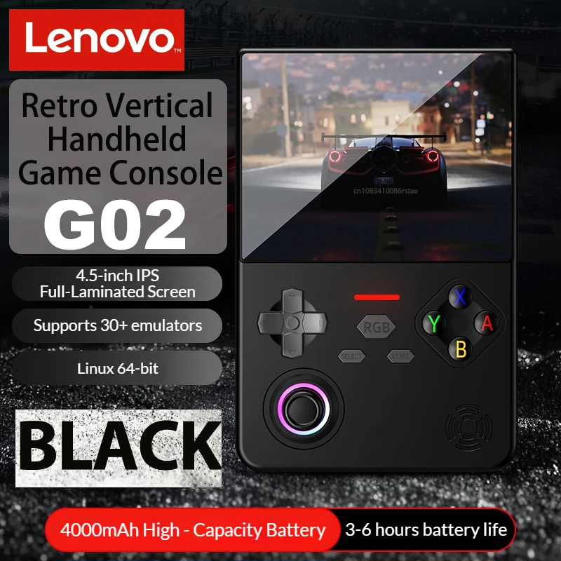 레노버 G02 게임 콘솔은 최적화된 64비트 리눅스 오픈소스 운영 체제와 쿼드 코어 RK3326 프로세서(클럭 속도 1.5GHz)를 탑재하고 있으며, PSP, PS1, 세가 새턴, 드림캐스트, N64, NDS, GBA, GBC, SFC, FC, MAME 등 20개 이상의 플랫폼 게임을 실행할 수 있습니다.