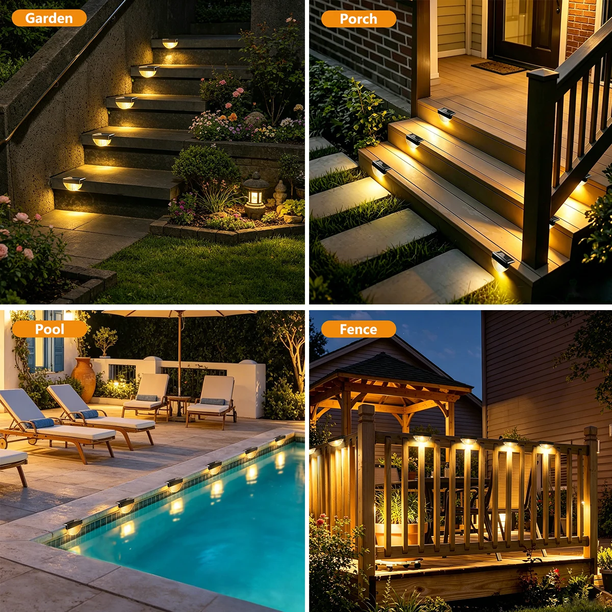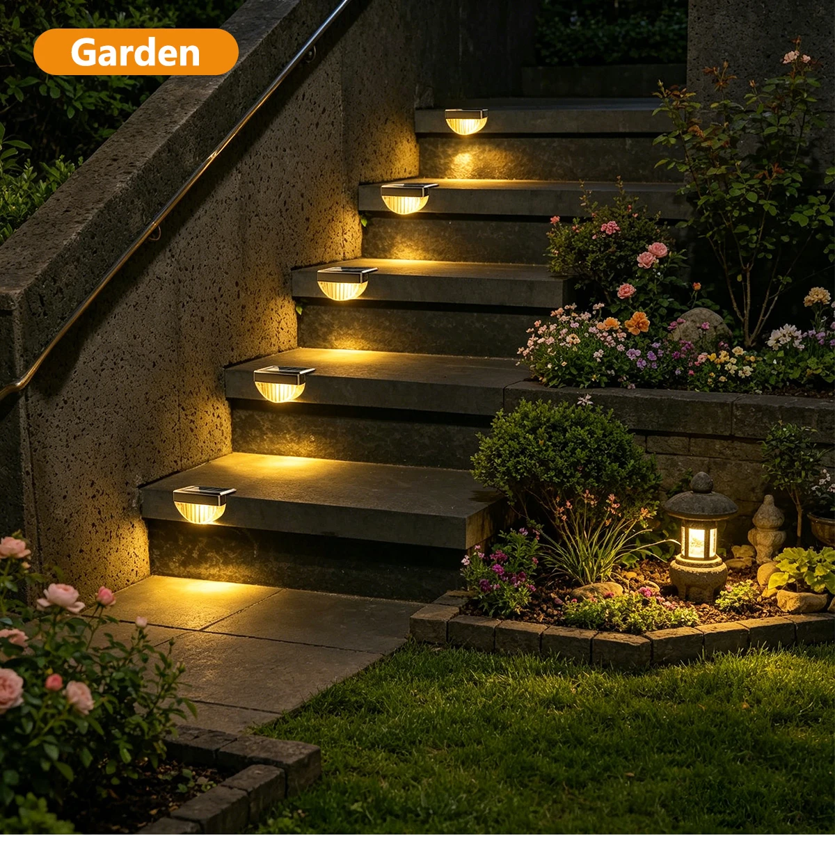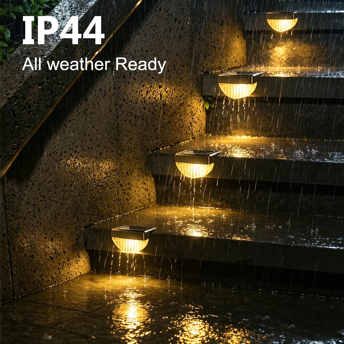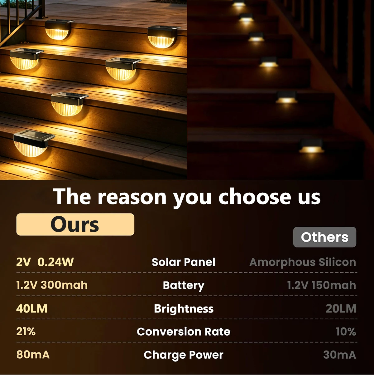 【자동 ON/OFF】-- 태양광 계단등은 더 효율적인 태양광 패널과 최대 21%의 높은 전환율을 갖추고 있습니다. 실외 태양광 계단등은 4-6시간 충전 후 8-12시간 동안 빛을 밝힐 수 있습니다. 설치가 완료되면 해질녘에 자동으로 켜지고 새벽에 꺼집니다.