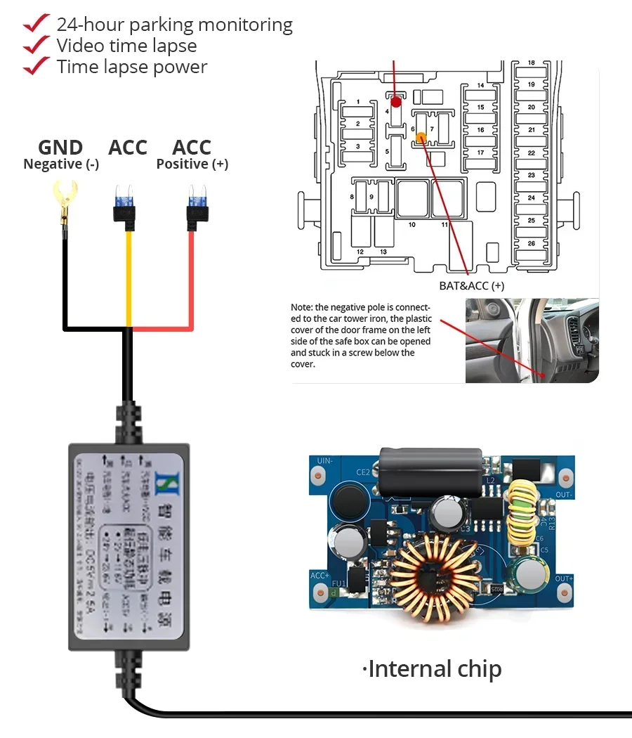 1. 자동차 퓨즈 박스 전원 공급 장치를 연결하세요.추천 상품, 버클 라인 구매 필수.)