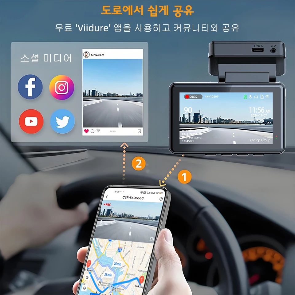 앱을 사용하여 iOS 및 Android 기기에서 실시간으로 블랙박스 영상을 확인하고 재생하며 관리하세요. 앱을 통해 녹화된 4K 영상을 휴대폰으로 직접 다운로드하거나, 여행 중의 풍경과 주요 순간을 한 번의 클릭으로 소셜 미디어에 공유할 수 있습니다.