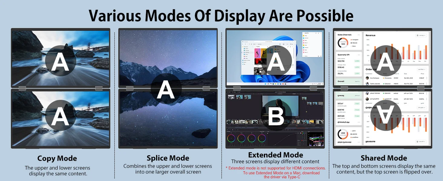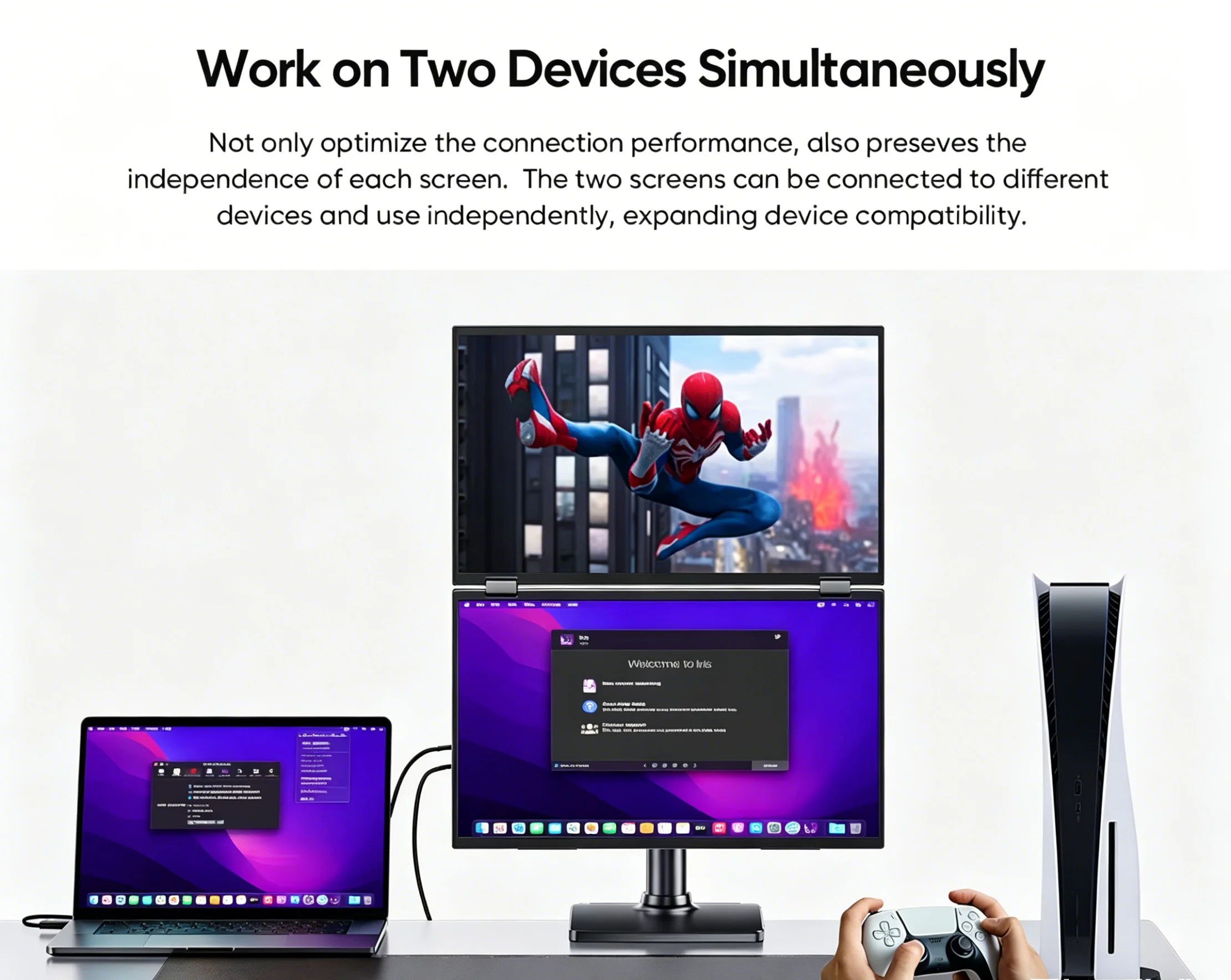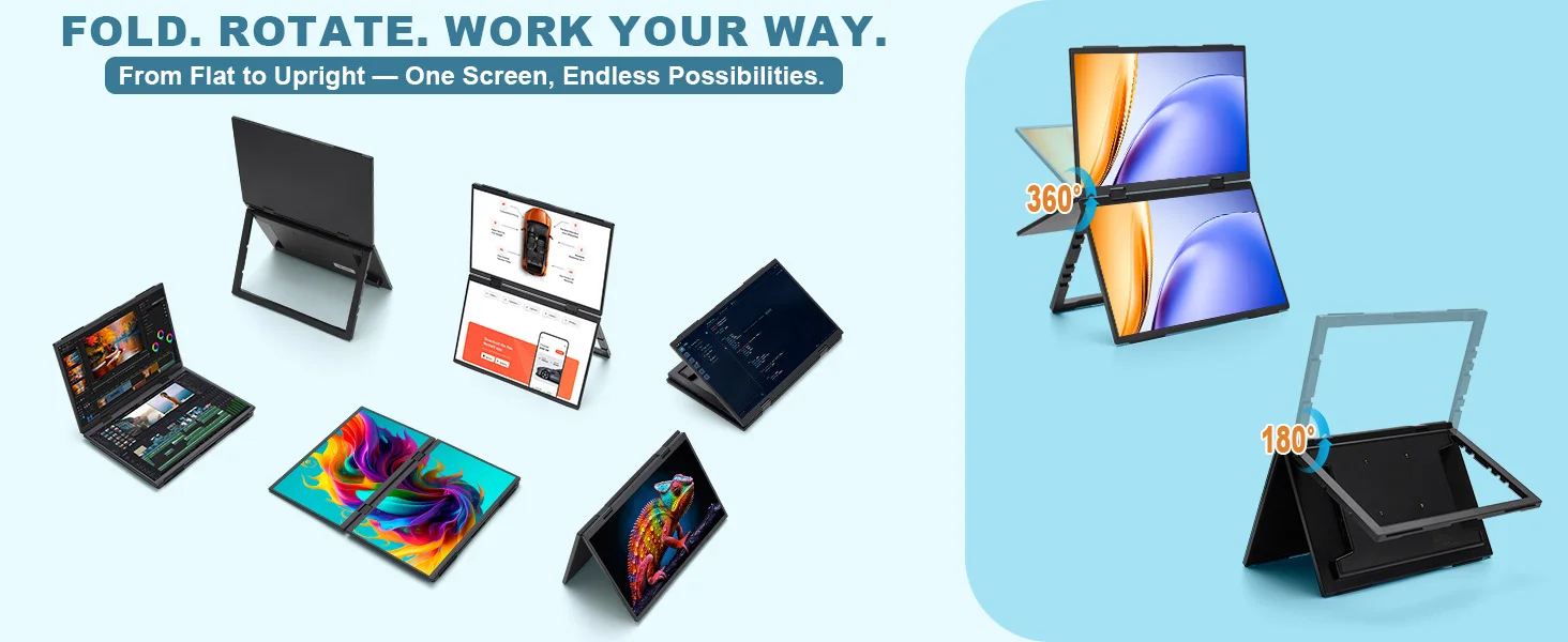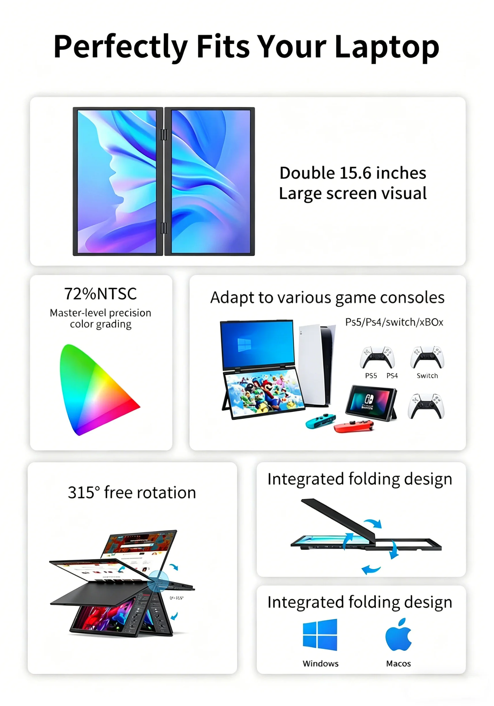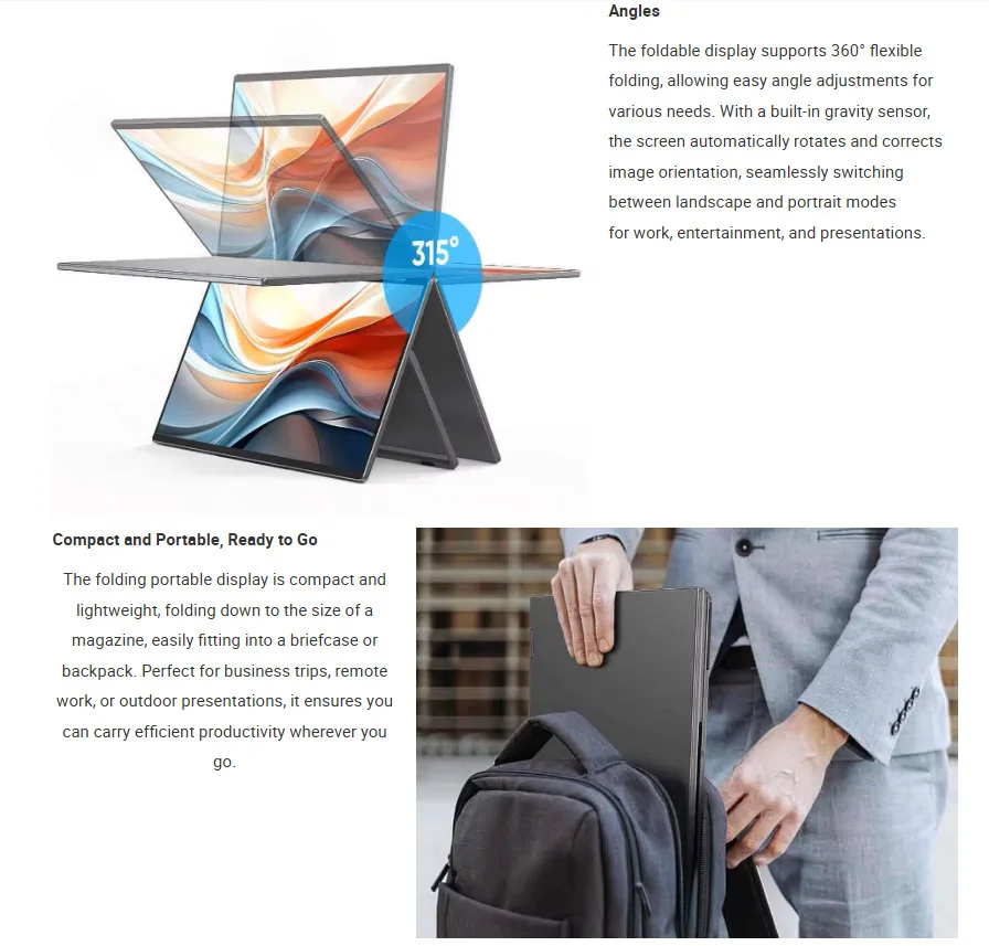 15.6인치 접이식 모니터는 사용자의 관점에 기반하여 사용자의 요구를 완벽히 충족합니다. 듀얼 스크린은 멀티태스킹을 위한 원스톱 워크스테이션을 제공하여 작업이 더 이상 번거롭지 않게 만듭니다. 사용자 정의 작업 창은 더 높은 작업 효율성과 생산성을 가져다줍니다.