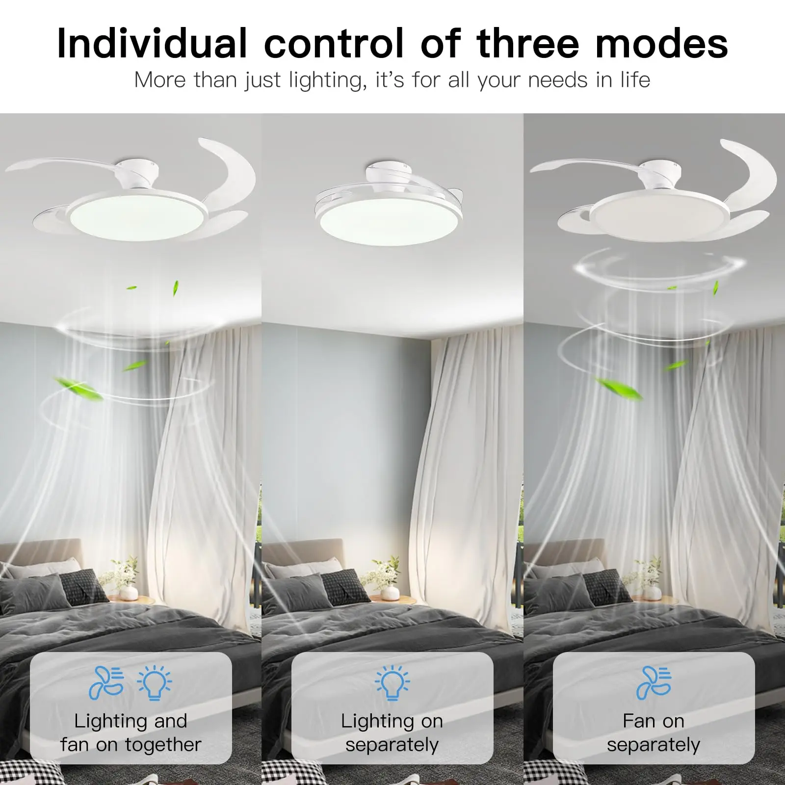 6단계 풍속과 지능형 타이머 기능이 결합되어 계절별 공기 공급 요구를 충족합니다. 독특한 접이식 팬 블레이드 디자인은 사용하지 않을 때 자동으로 접혀 간단하고 아름다우며 공간을 절약할 수 있습니다. 모바일 앱과 리모컨을 통한 이중 제어를 지원하며, 조명과 팬을 개별적으로 조정할 수 있어 지능과 편리함이 생활의 모든 세부 사항에 통합됩니다. 스타일리시하면서도 실용적인 홈 경험을 제공합니다.