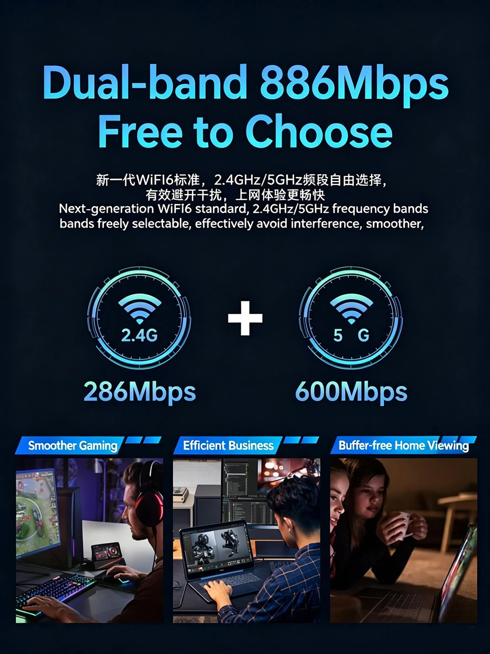 ✔ WiFi 6 AX900 (802.11ax) – 초고속 속도 최대 286Mbps (2.4GHz) + 600Mbps (5GHz)