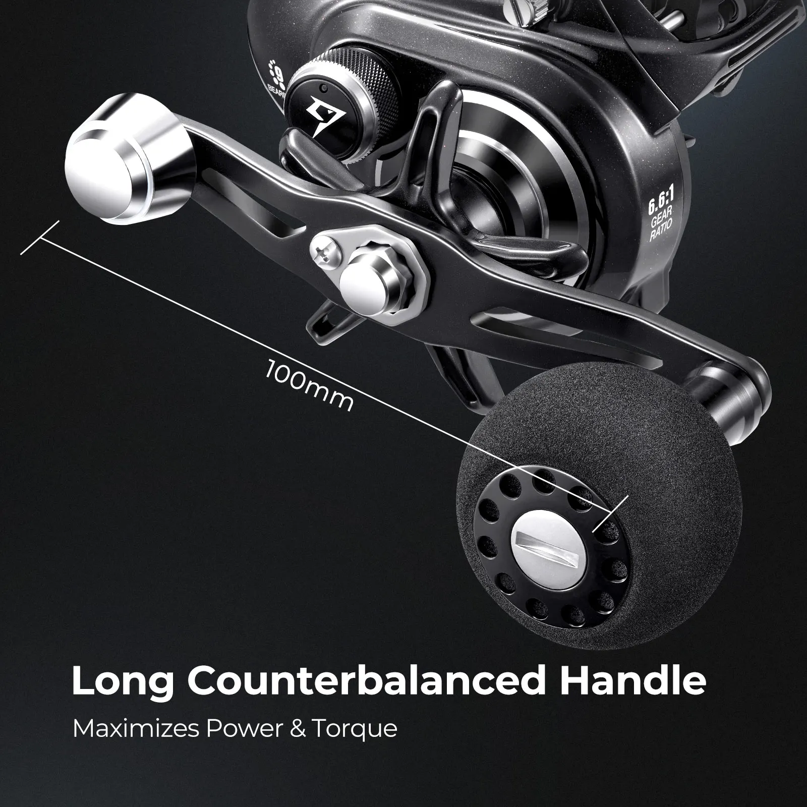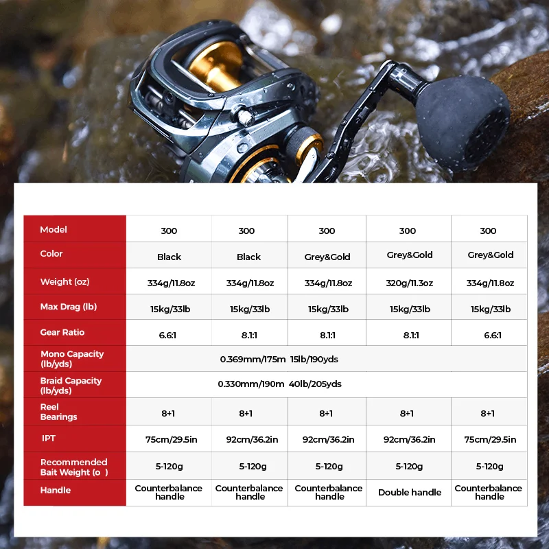 5. [다중 선택] Alijoz 300 베이트캐스트 릴은 6.6:1 및 8.1:1 기어비 옵션을 제공하며, 다양한 색상 코팅 기능으로 다목적 낚시 릴로 적합합니다. 저희 베이트캐스트 릴은 싱글 핸들 디자인과 더블 핸들 디자인을 제공합니다. 업그레이드된 싱글 핸들 모델에는 더블 핸들 릴의 균형을 맞추기 위해 추가 카운터웨이트가 추가되었습니다.